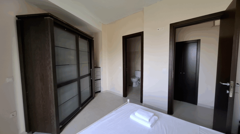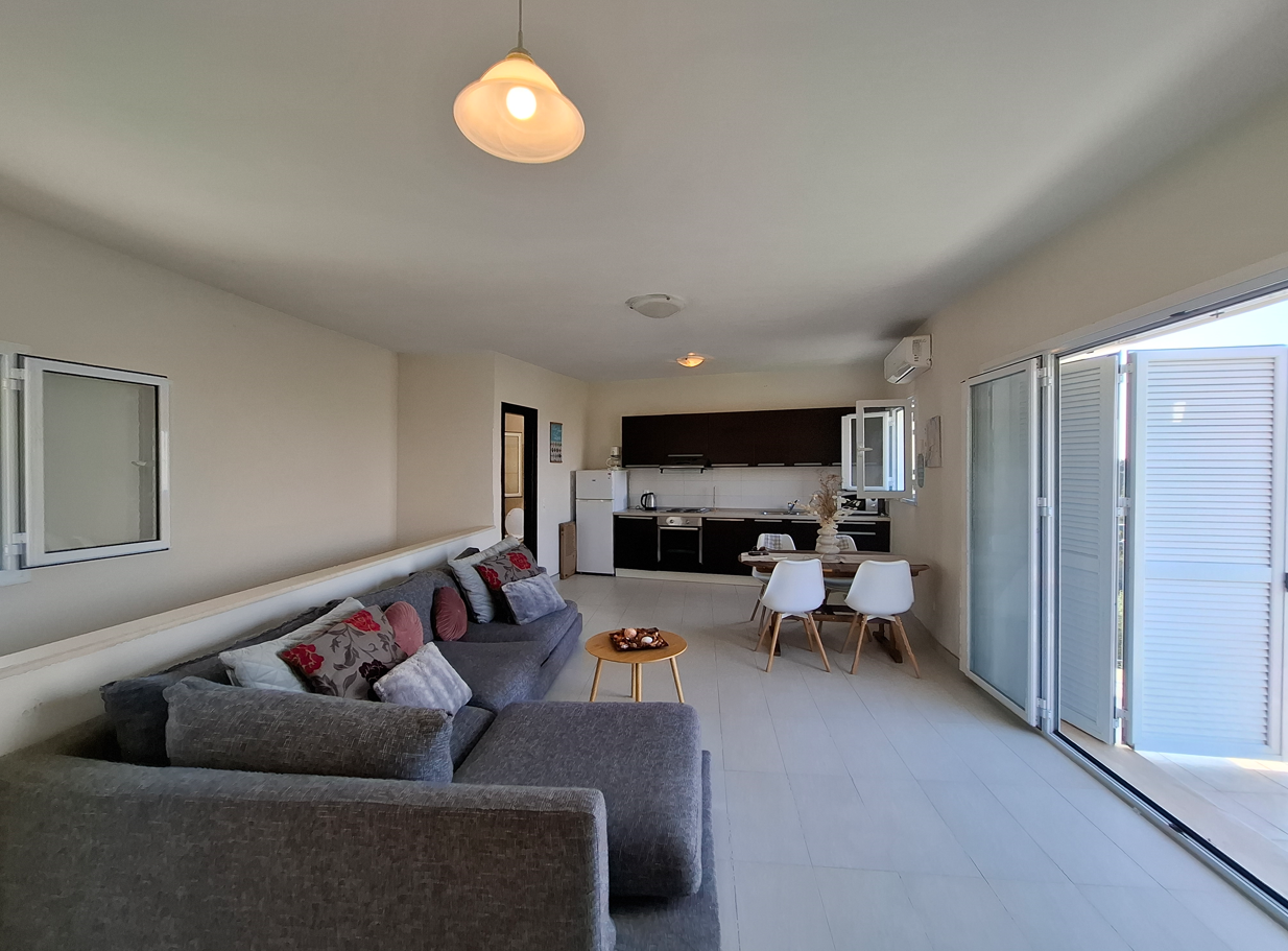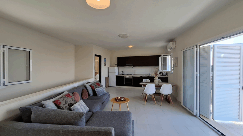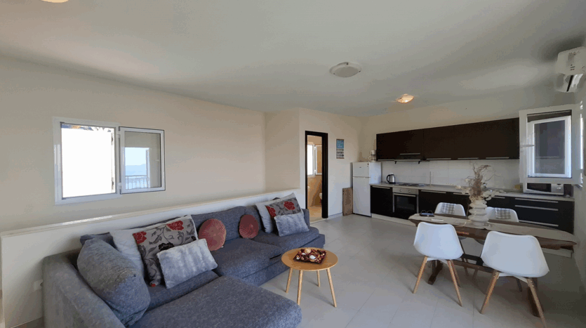You enter into the main living area – a spacious open-plan space with room for dining, lounging, and even a small home office. Glass doors open to a wide balcony where you can take in uninterrupted sea and town views.