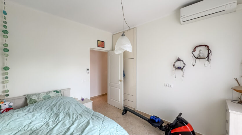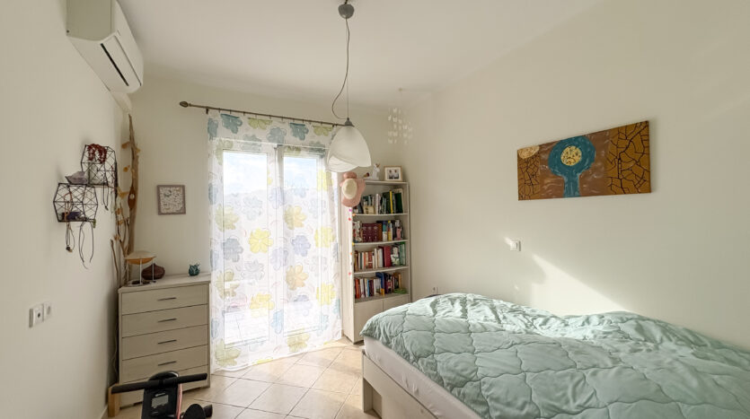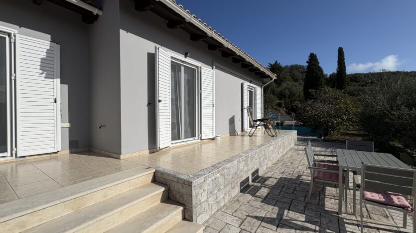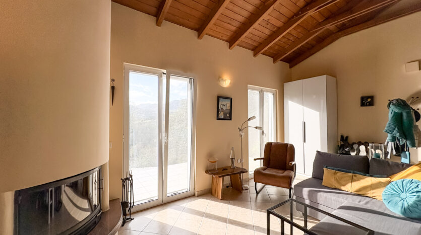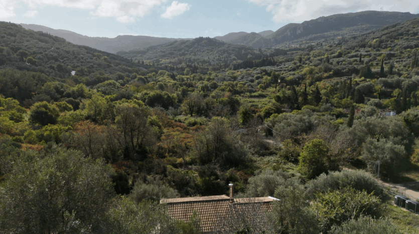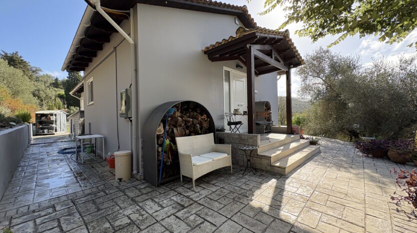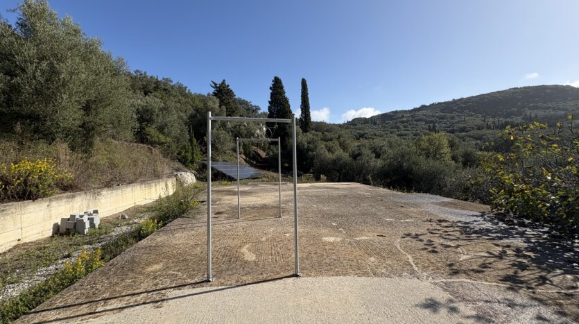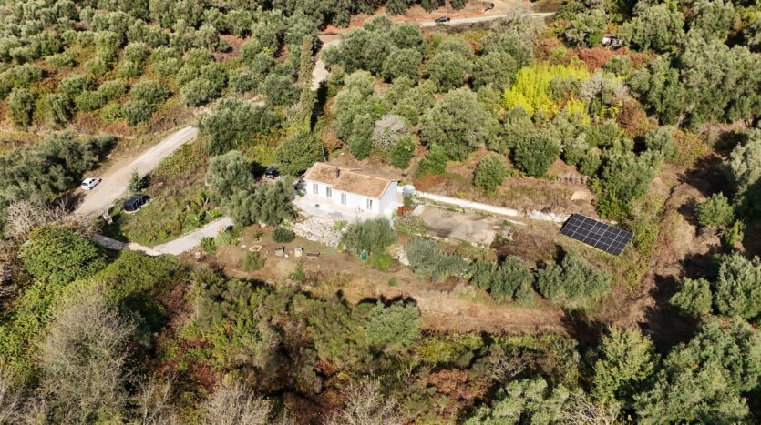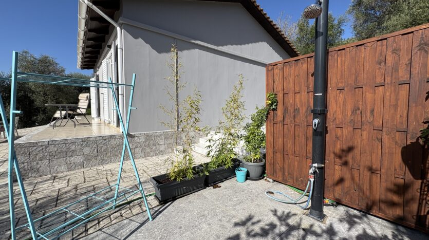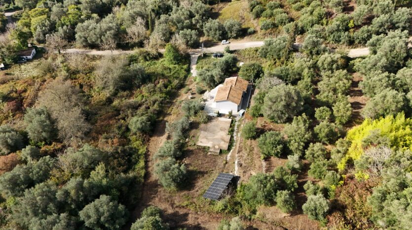 Outside, the property feels both natural and alive — olive trees that produce your own yearly oil, fruit trees including fig and pomegranate, raised garden beds for vegetables, and a small stream that runs gently through the land. A paved access road leads to parking for three cars, with space to create outdoor seating or a pool area if desired. This is a rare balance between independence, modern design, and the peaceful nature that defines this part of Corfu.