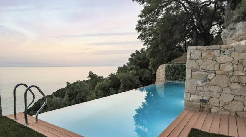 A brand-new luxury villa perched dramatically on the cliffs of Corfu’s serene west coast.