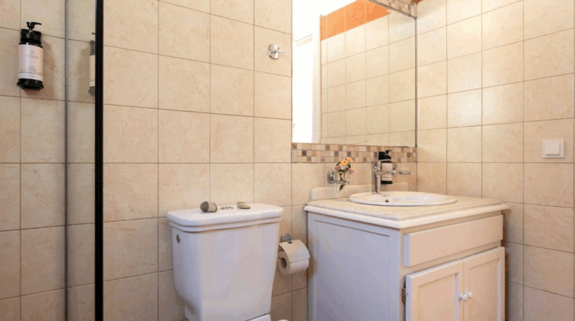 The property spans two levels, connected by a decorative iron staircase. On the ground floor, you’ll find a bright and open living space that combines the lounge, kitchen, and dining areas. Large windows lead out to a sunny terrace and private pool. One of the three bedrooms, complete with ensuite bathroom, is also on this level.