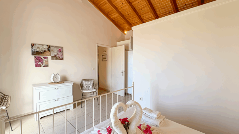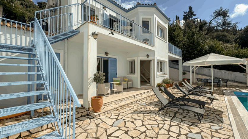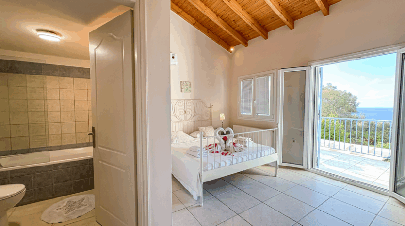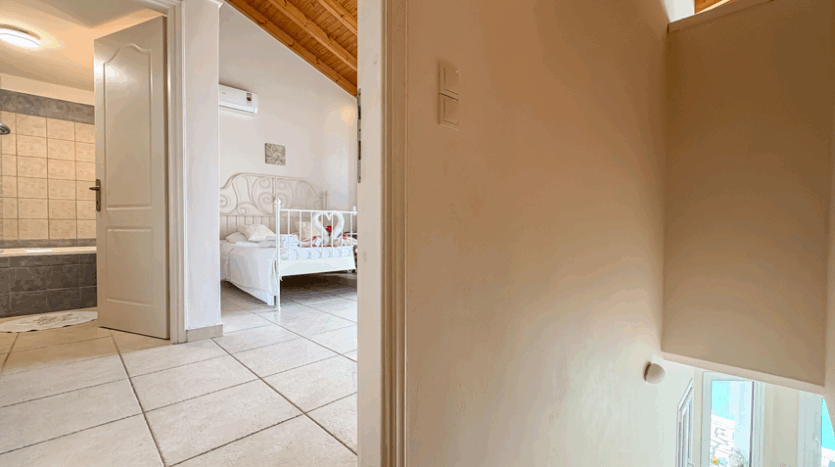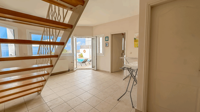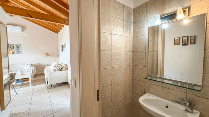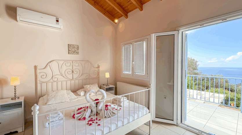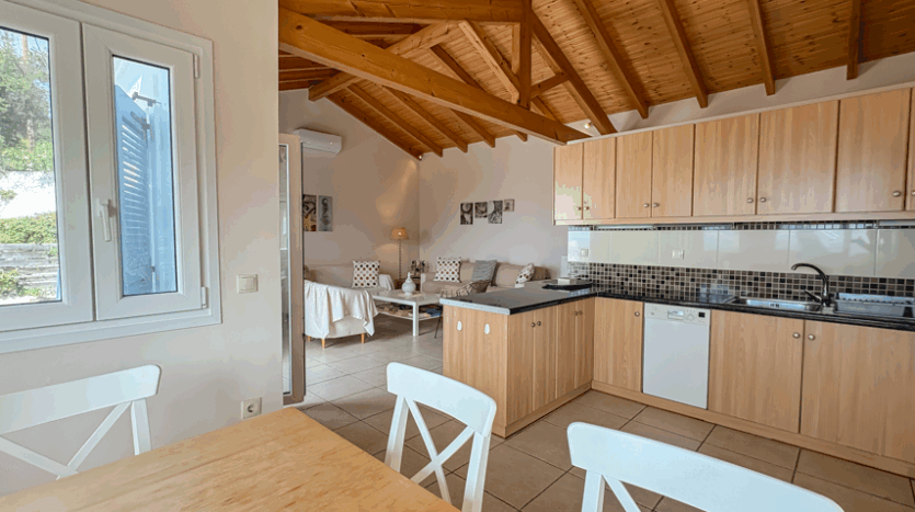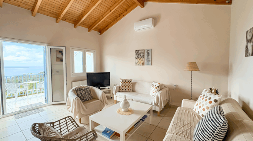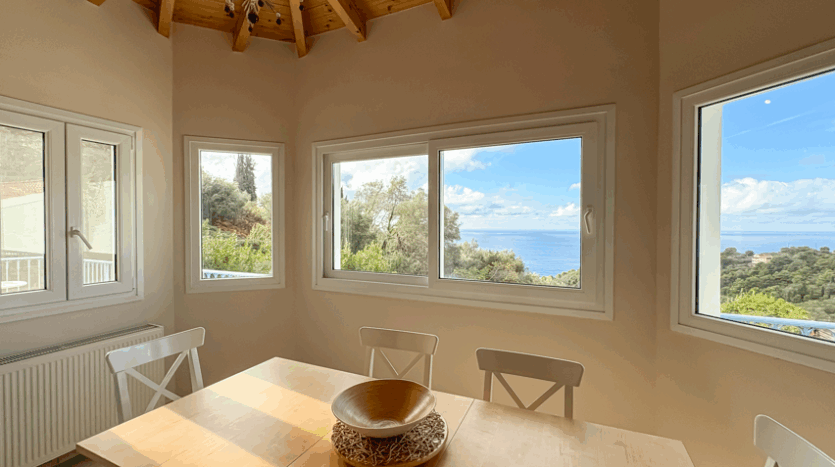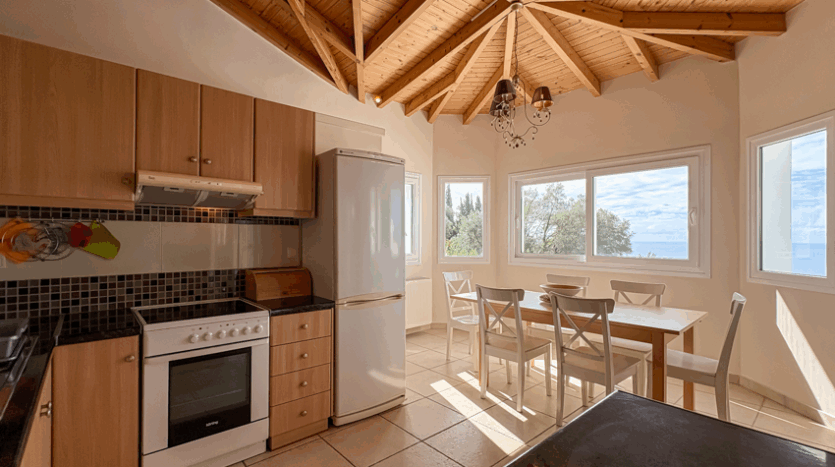 This beautiful 3-bedroom villa enjoys one of the most impressive sea views on Corfu’s west coast. Built over two levels with a total area of 170m², it has been thoughtfully designed to make the most of the scenery from every angle. The main entrance opens onto a bright living area with high wooden ceilings and large glass doors that fill the space with natural light. The open-plan kitchen and lounge connect seamlessly to a wide balcony, ideal for dining outdoors and enjoying the sunset over the Ionian Sea.