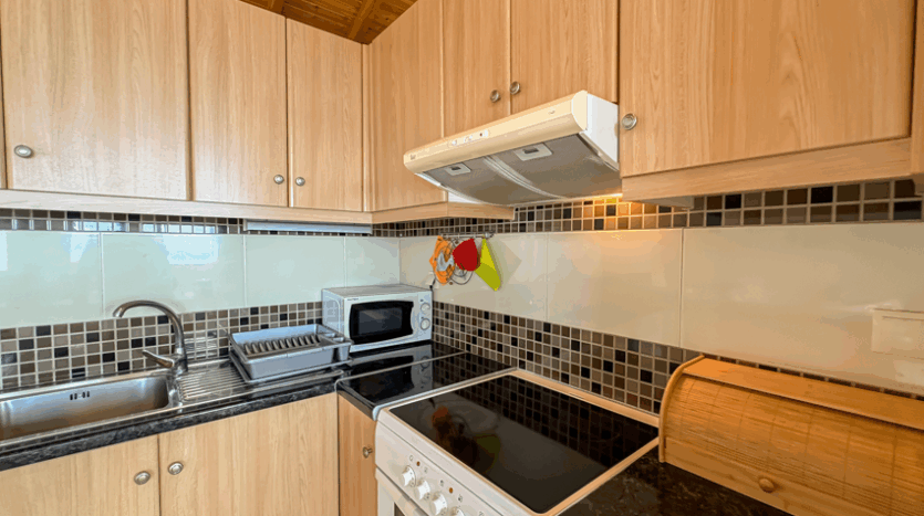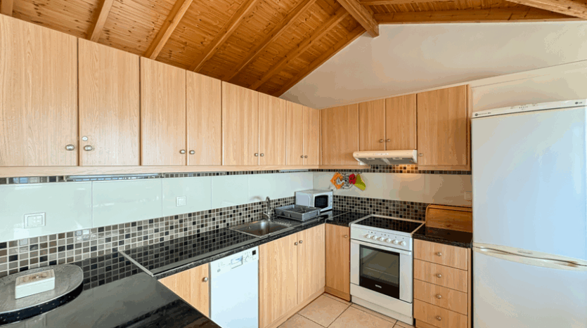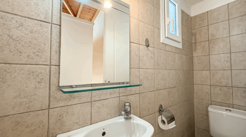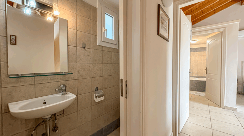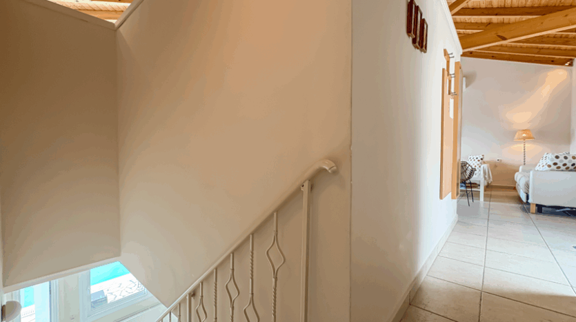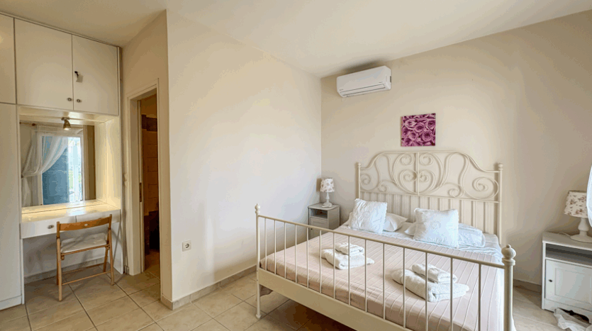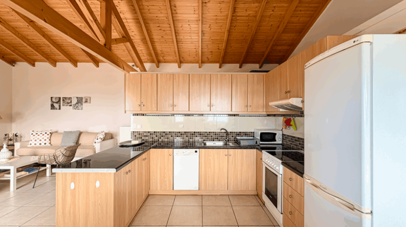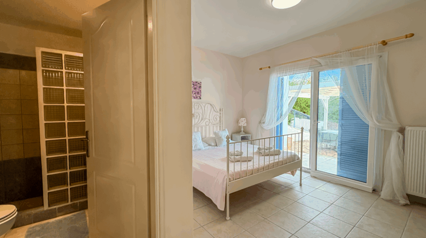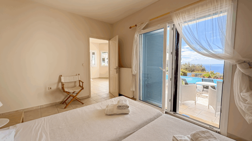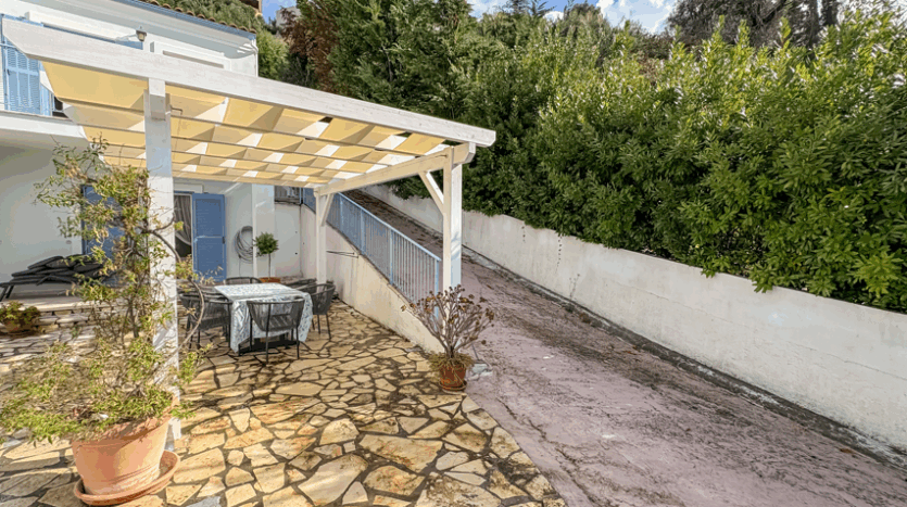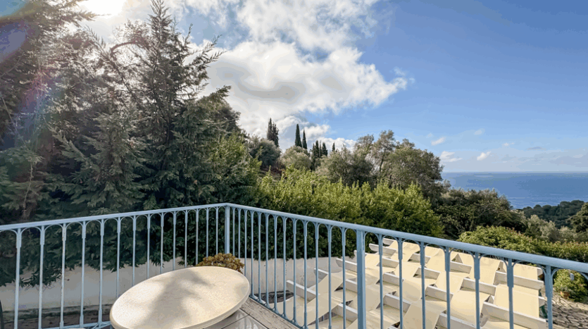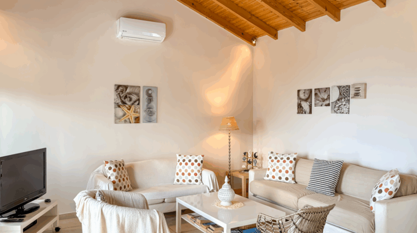 This beautiful 3-bedroom villa enjoys one of the most impressive sea views on Corfu’s west coast. Built over two levels with a total area of 170m², it has been thoughtfully designed to make the most of the scenery from every angle. The main entrance opens onto a bright living area with high wooden ceilings and large glass doors that fill the space with natural light. The open-plan kitchen and lounge connect seamlessly to a wide balcony, ideal for dining outdoors and enjoying the sunset over the Ionian Sea.
