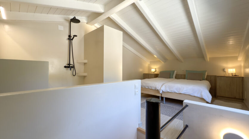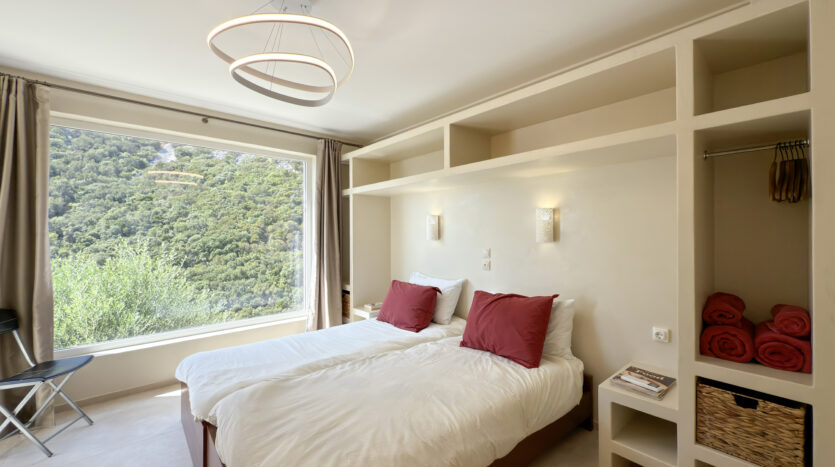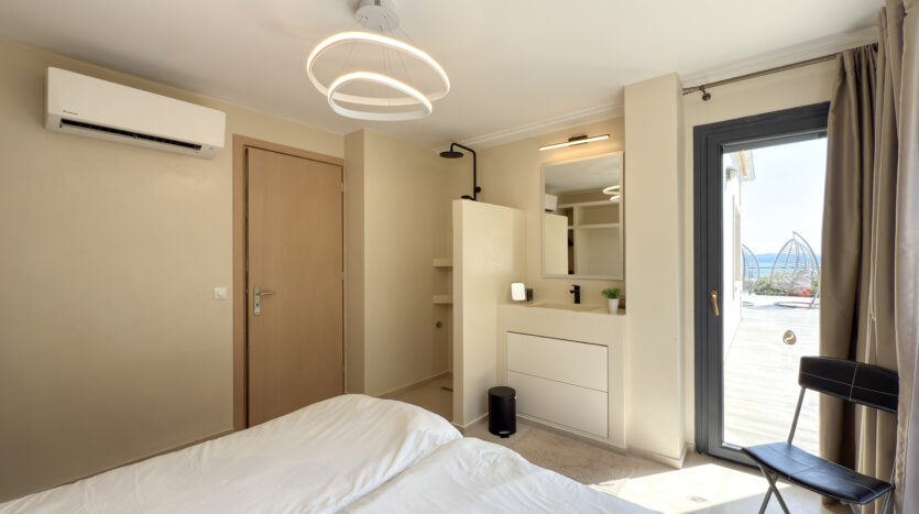 The villa unfolds across three levels. The main floor is defined by an open-plan living space where floor-to-ceiling windows frame sweeping vistas and extend directly onto the entertainment terrace. An ensuite bedroom also occupies this level, perfectly placed to enjoy both indoor and outdoor living. Above, a carefully conceived bedroom with an open bathroom maximises elevation and natural light, while the lower level houses the master suite – a private retreat with vast glazing and dramatic views that set the tone from sunrise to sunset.