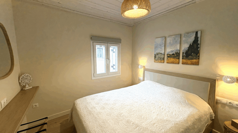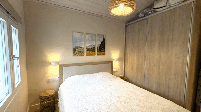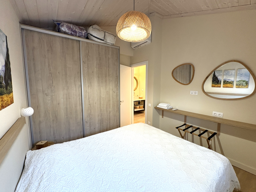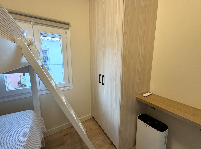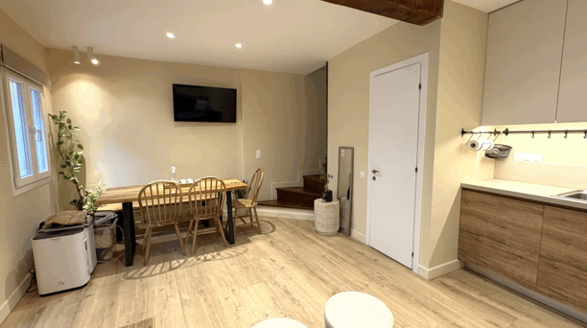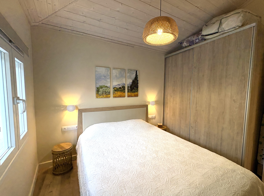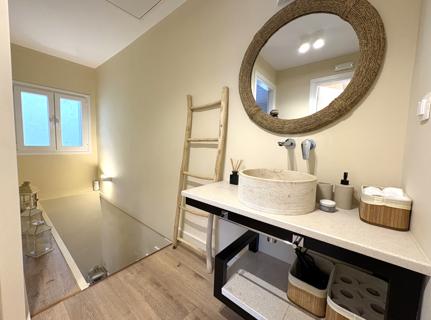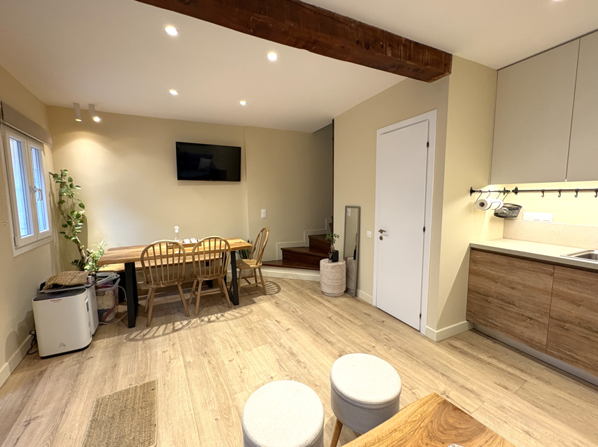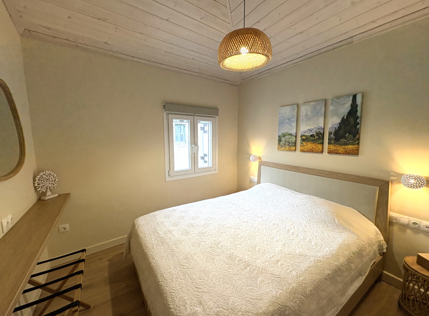 Inside, the ground floor features an open-plan living area with a fitted kitchen, dining space, and lounge. There are two bedrooms, one bathroom, and an additional WC. The renovation includes waterproof laminate flooring, air conditioning throughout, mosquito nets on all windows, and modern lighting, creating a comfortable and easy to maintain home.
