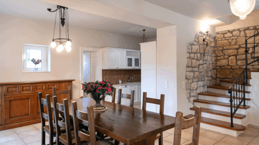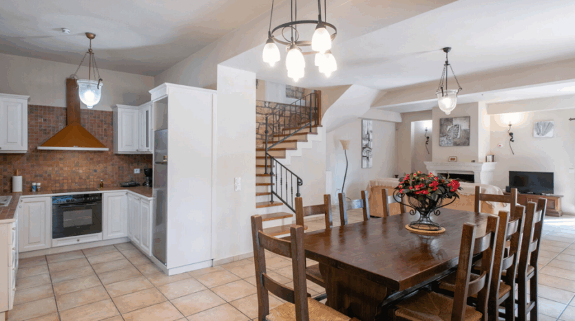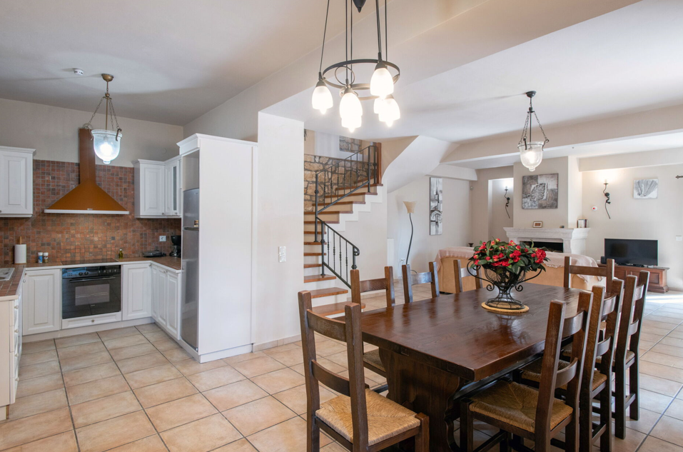 Spanning two levels, the villa has been thoughtfully laid out to maximise both comfort and natural light. The ground floor features an open-plan living, dining, and kitchen area, with large windows that open directly onto a sun-drenched terrace and private pool. A rustic fireplace adds character and warmth during the cooler months, while the flowing layout makes it perfect for both relaxing and entertaining.