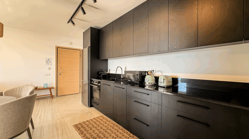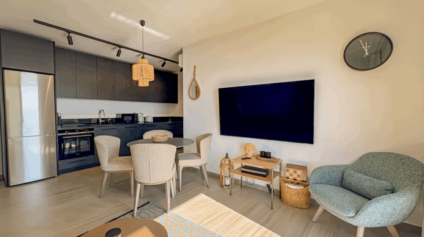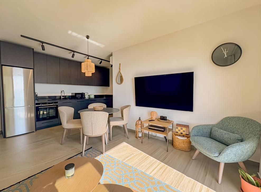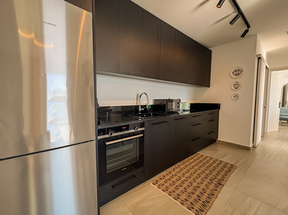Built in 2022, this 90m² apartment is in immaculate condition and comes fully furnished with high-quality furniture and appliances. The spacious, open-plan living room and kitchen area is perfect for modern living. Both double bedrooms and the living room offer direct access to a long balcony, where you can enjoy uninterrupted views of the sea.