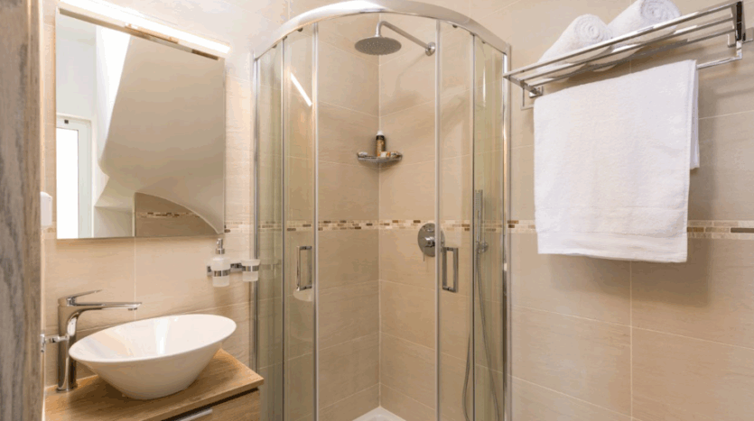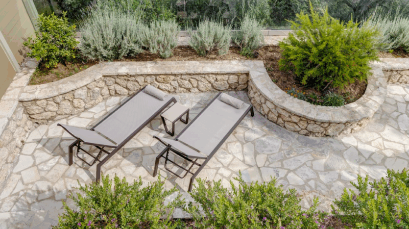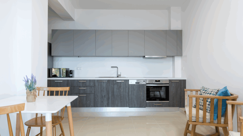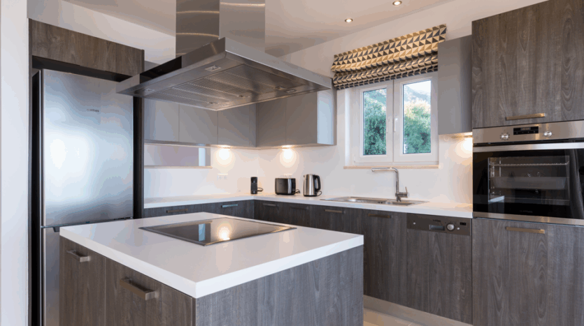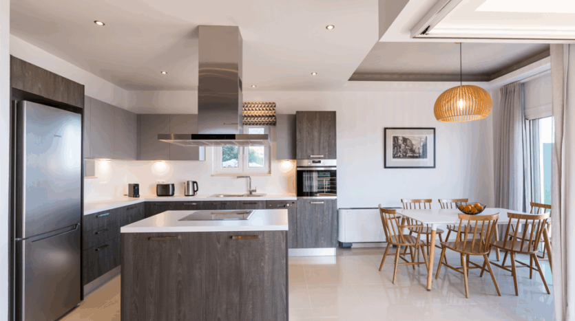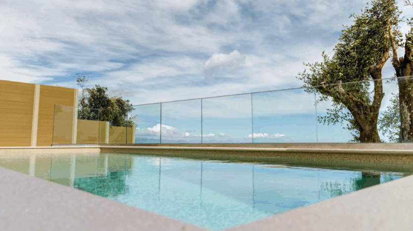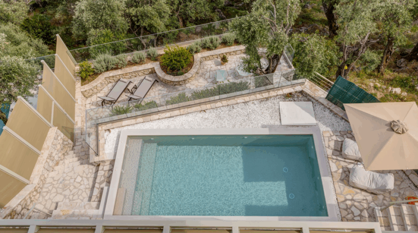 The lower floor is a fully independent space featuring one bedroom, a kitchen, and a bathroom — ideal for guests or family members who prefer a bit more privacy. From this level, you step directly onto the pool terrace, where the saltwater pool sits surrounded by green space and open blue views. The villa’s clean design and solid build quality are clear in every detail, from the materials used to the thoughtful layout of each level.