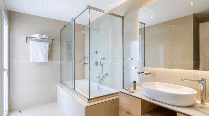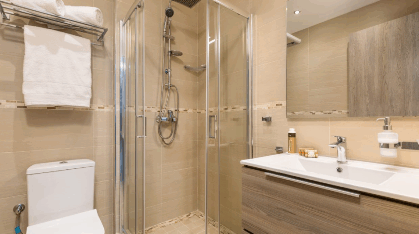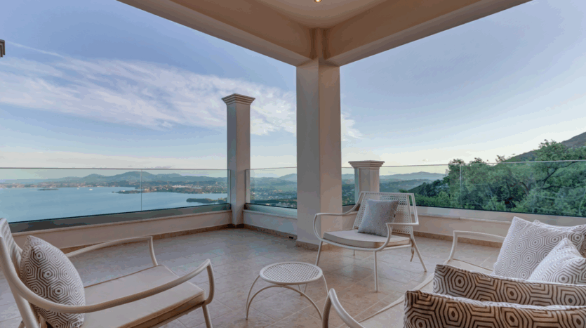 The upper level is entirely private, with the master bedroom offering an en-suite bathroom and direct access to a sea-facing balcony. Two additional bedrooms share a spacious bathroom, and each opens onto a terrace where the views continue — creating an easy sense of connection between the indoors and outdoors.