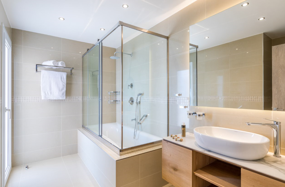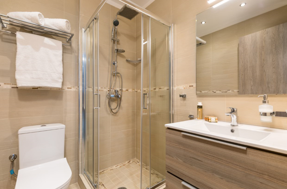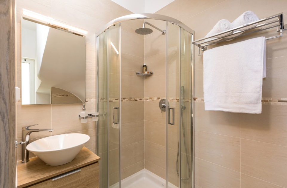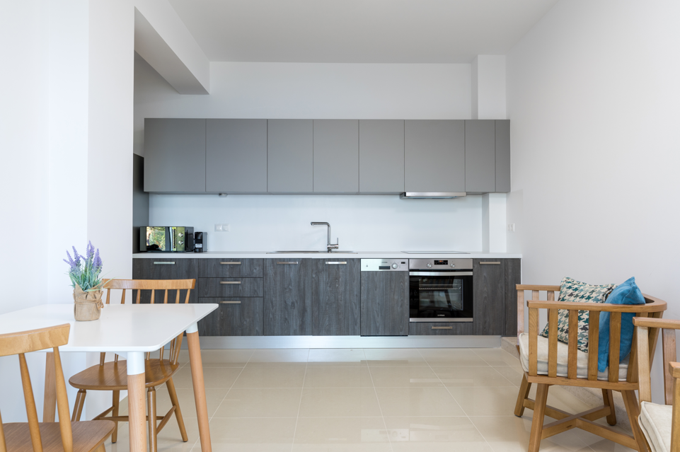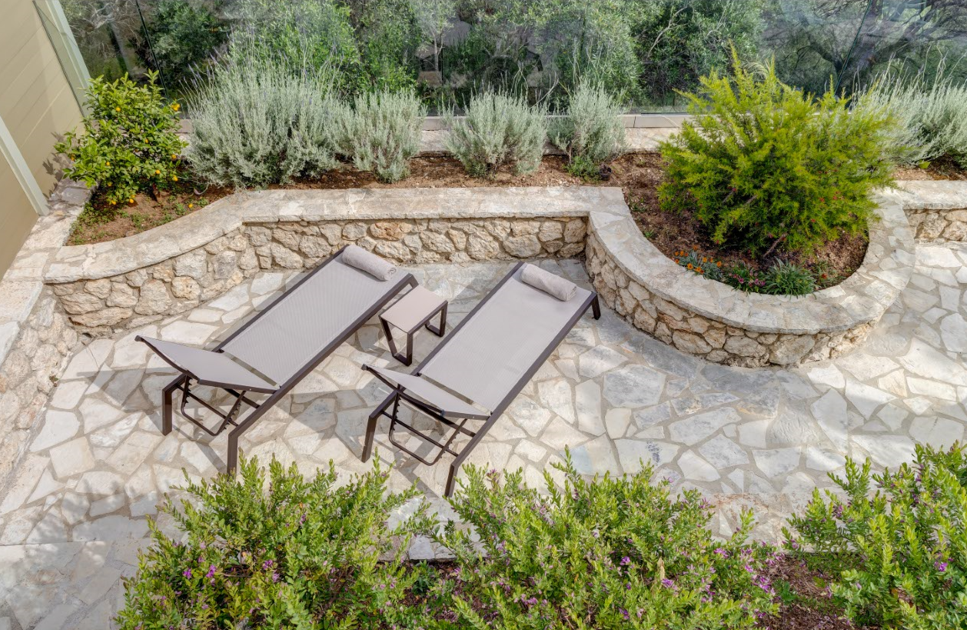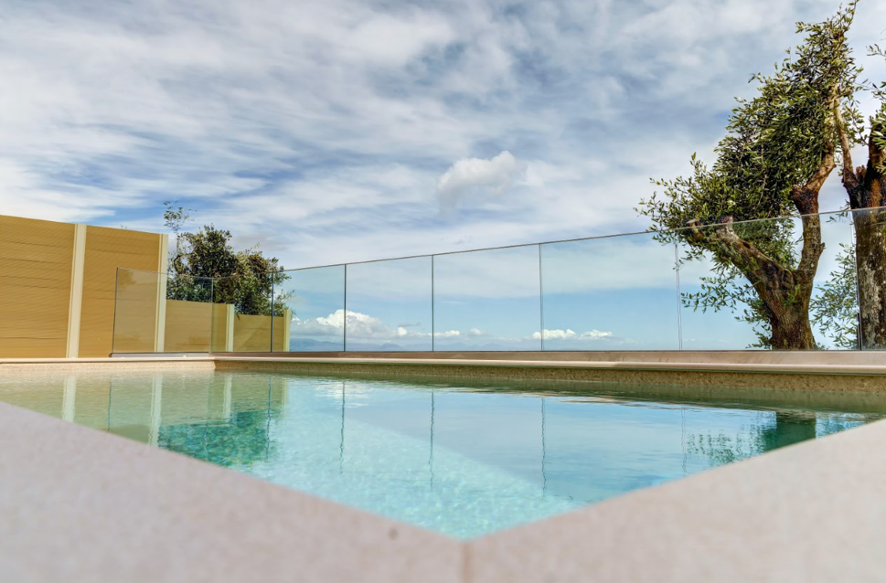 The lower floor is a fully independent space featuring one bedroom, a kitchen, and a bathroom — ideal for guests or family members who prefer a bit more privacy. From this level, you step directly onto the pool terrace, where the saltwater pool sits surrounded by green space and open blue views. The villa’s clean design and solid build quality are clear in every detail, from the materials used to the thoughtful layout of each level.