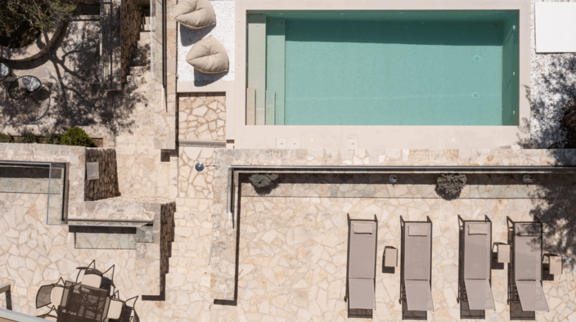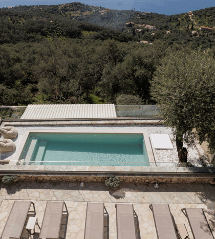 The ground floor offers an independent guest area — a one-bedroom space with its own kitchen, bathroom, and access to the pool terrace. Stepping outside, the private saltwater pool is surrounded by a comfortable sun deck, creating a peaceful setting framed by sea and greenery. Every detail of this property — from the natural light to the layout — reflects thoughtful design and lasting quality.