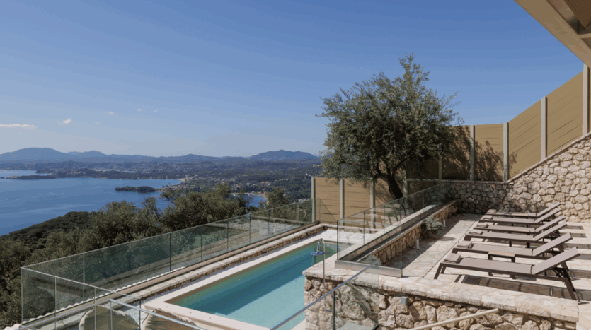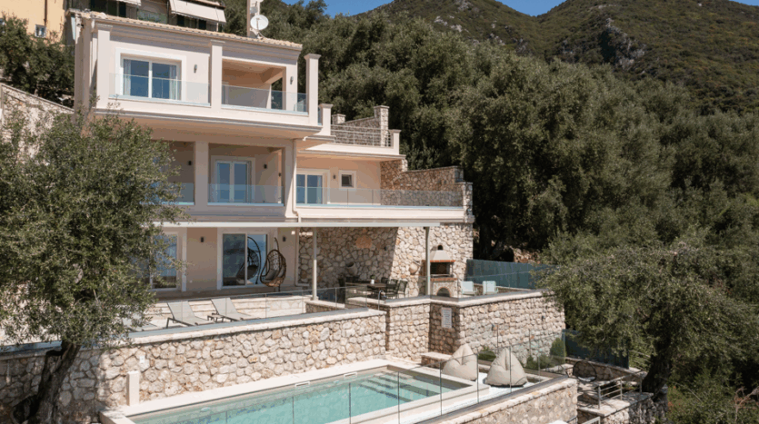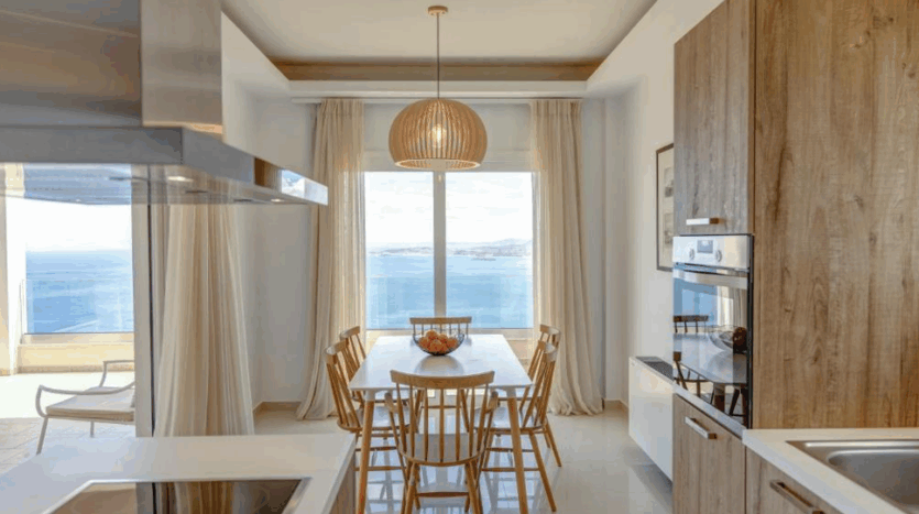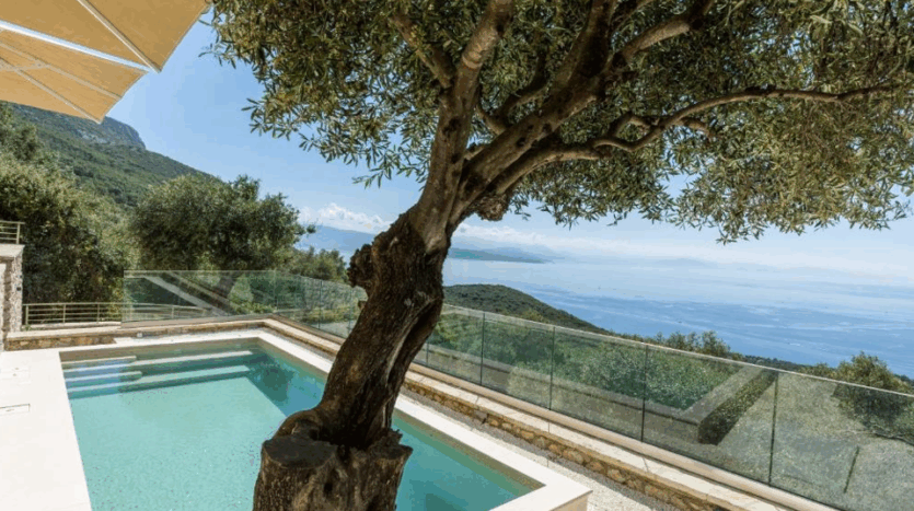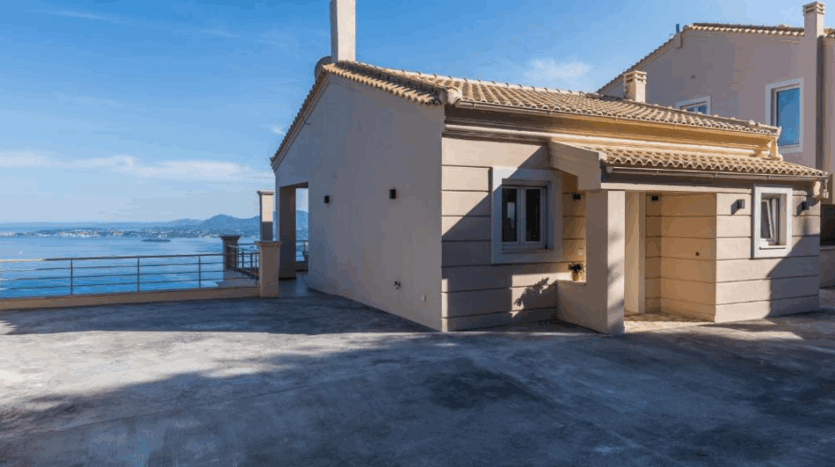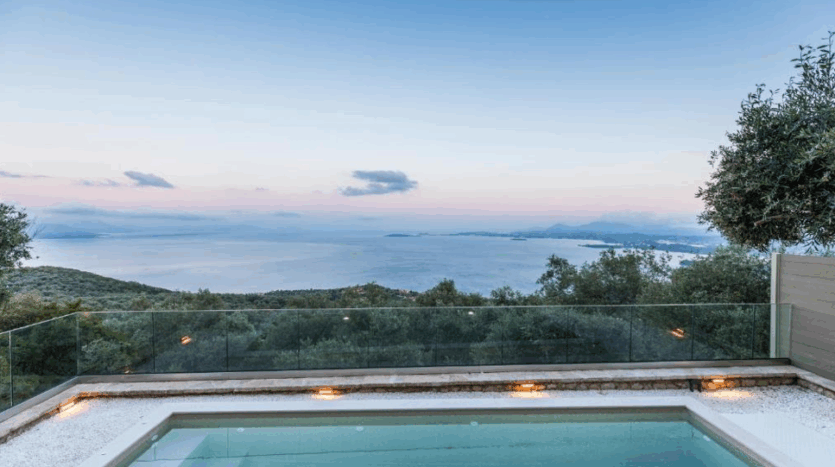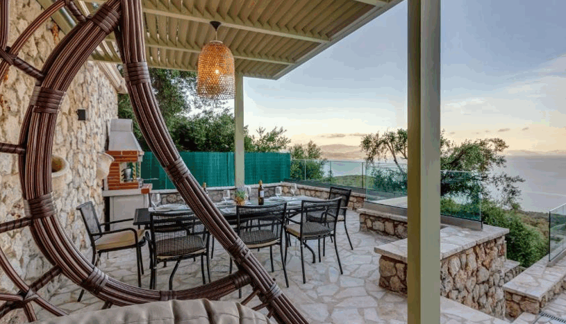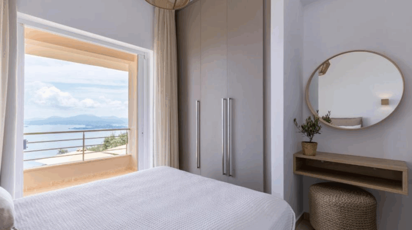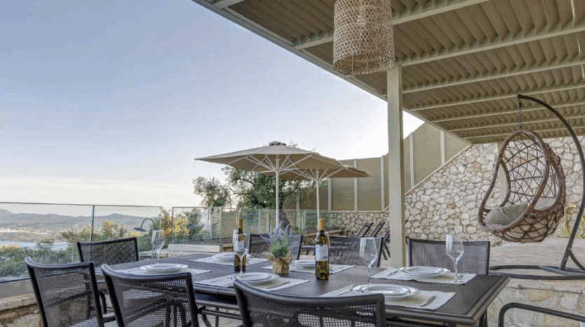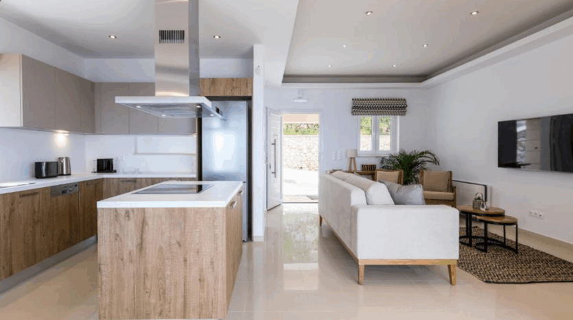Built in 2015, this four-bedroom villa covers 186 m² on a 750 m² plot, combining clean design with uninterrupted views over the Ionian Sea. Spread across three levels, the home has been planned to make the most of the natural light and the open surroundings. The main entrance opens into a spacious living area with large glass doors that lead straight out to a wide balcony — the perfect spot to unwind or share an evening meal outdoors. Inside, the open-plan kitchen connects easily with the dining space for eight, keeping the whole top level bright and sociable.