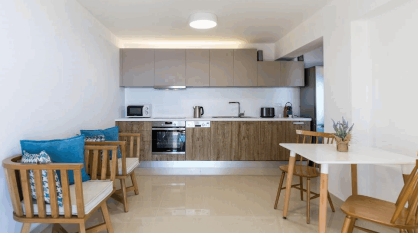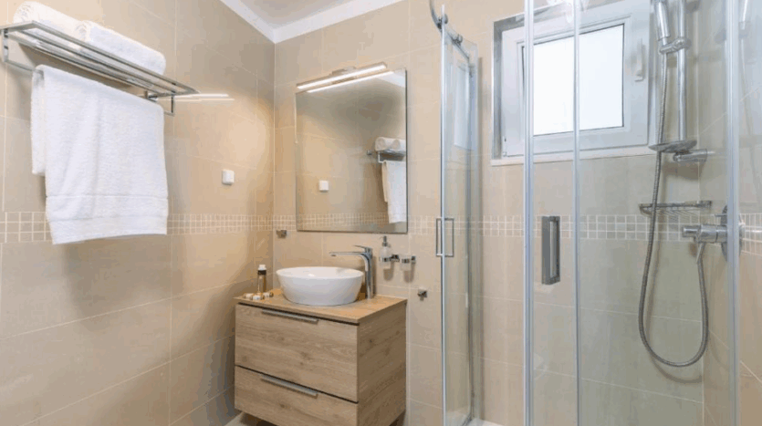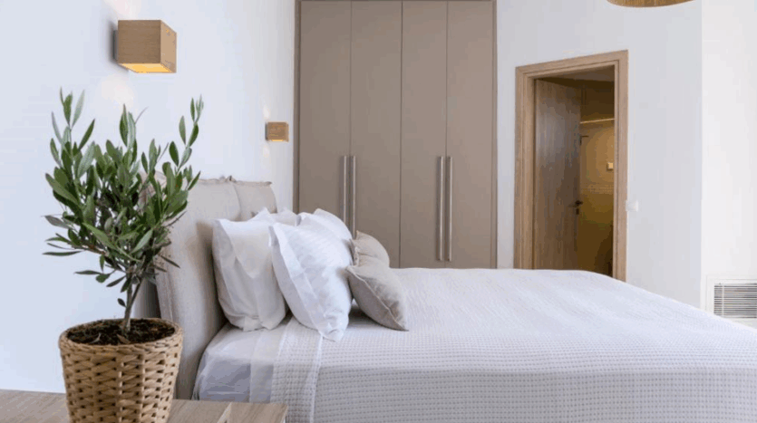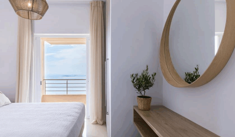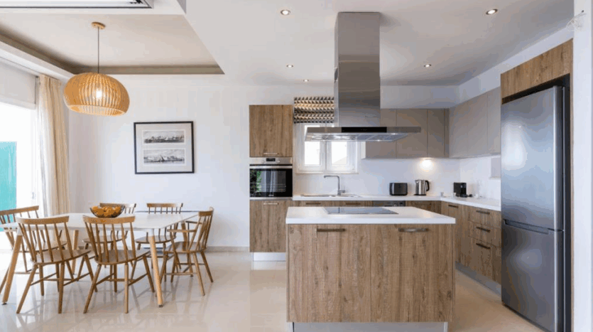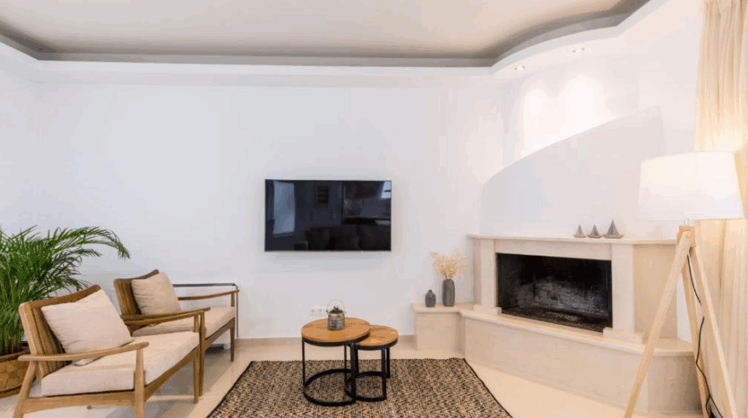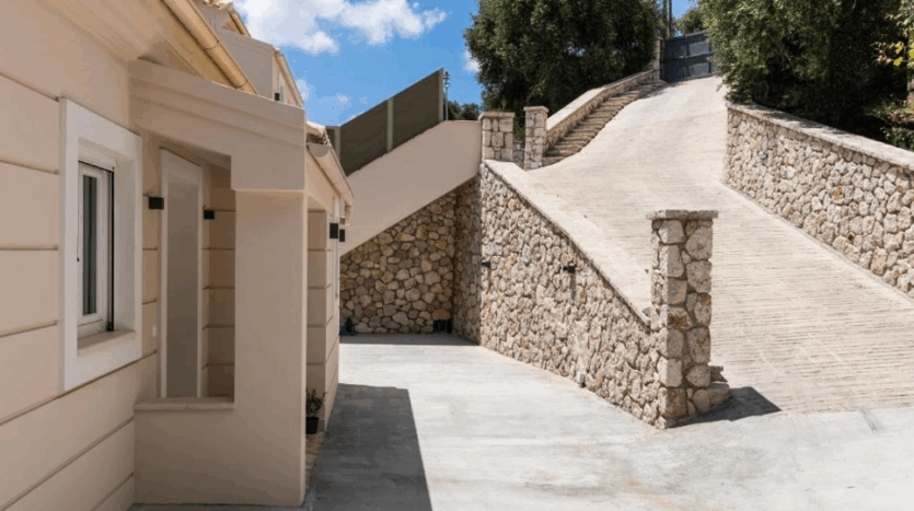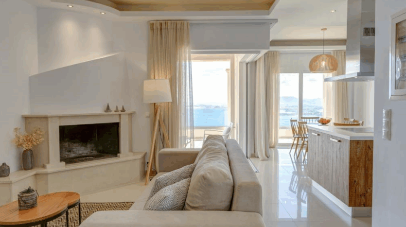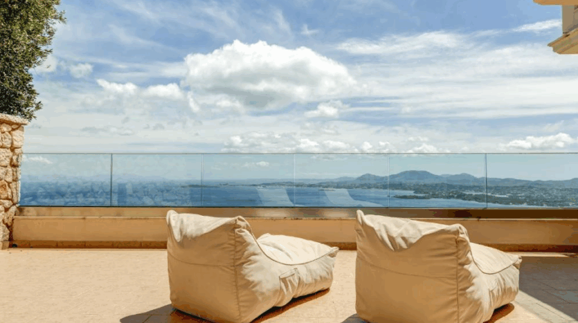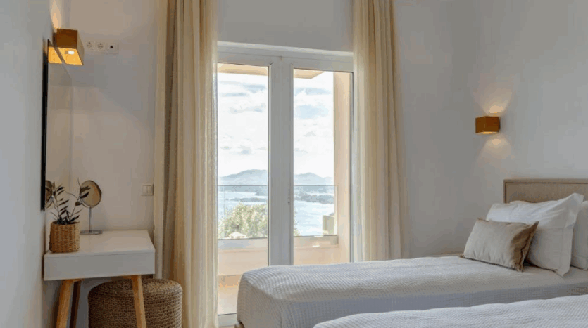 Built in 2015, this four-bedroom villa covers 186 m² on a 750 m² plot, combining clean design with uninterrupted views over the Ionian Sea. Spread across three levels, the home has been planned to make the most of the natural light and the open surroundings. The main entrance opens into a spacious living area with large glass doors that lead straight out to a wide balcony — the perfect spot to unwind or share an evening meal outdoors. Inside, the open-plan kitchen connects easily with the dining space for eight, keeping the whole top level bright and sociable.