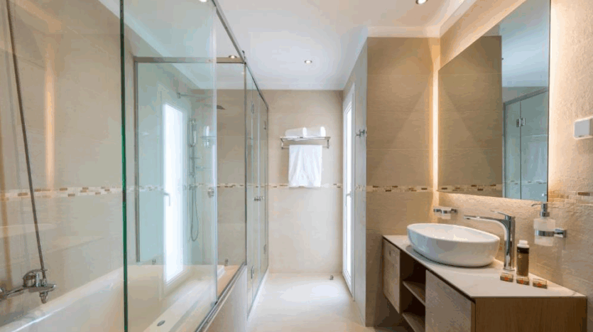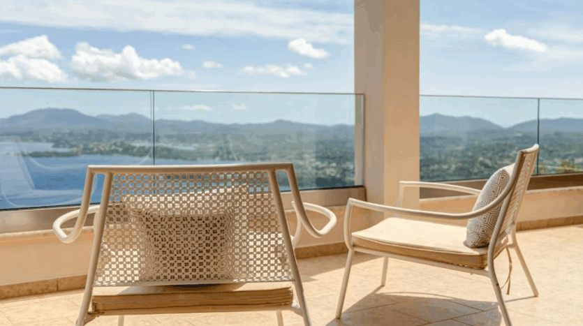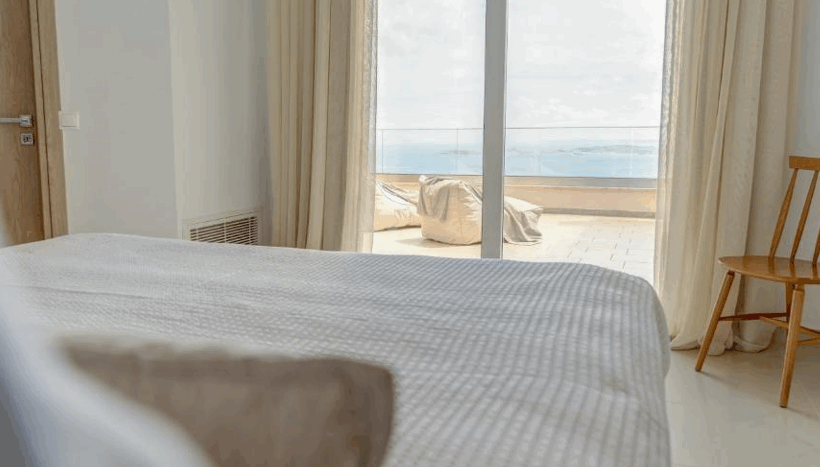 Upstairs, the master suite feels private and calm, complete with an en-suite bathroom and a sea-facing balcony that captures the sunrise. Two more bedrooms share a generous bathroom, and both open directly to a shared terrace where the view stretches right across the coast.