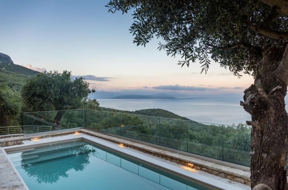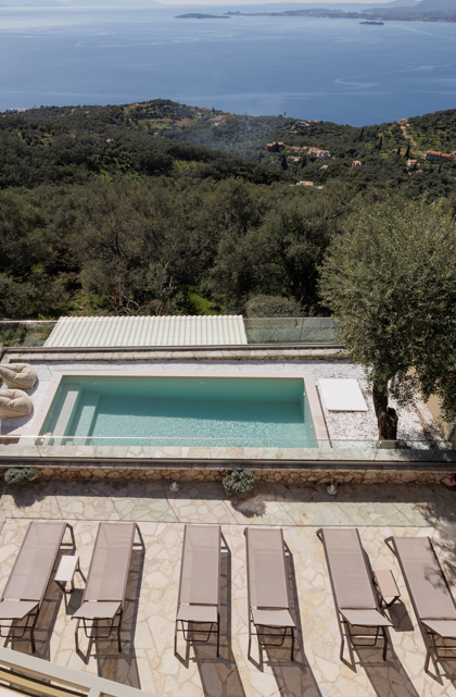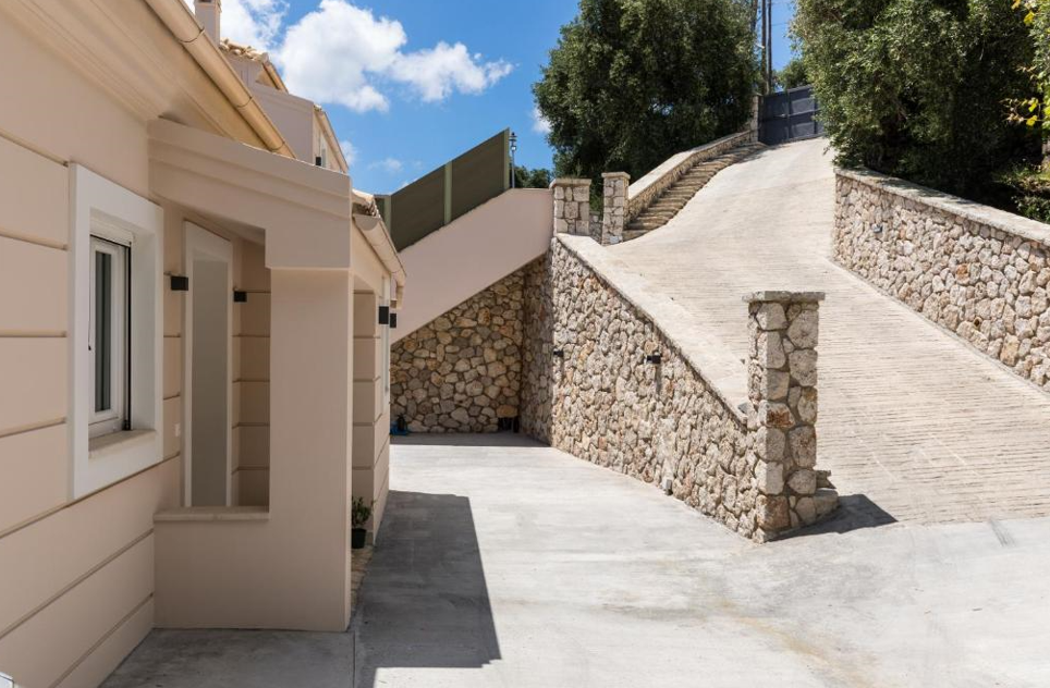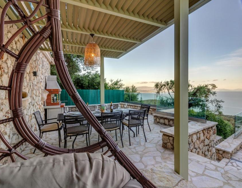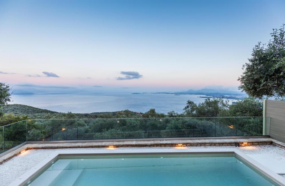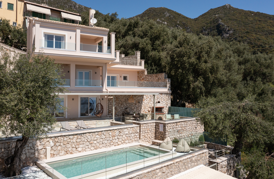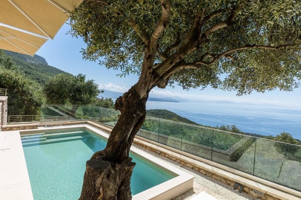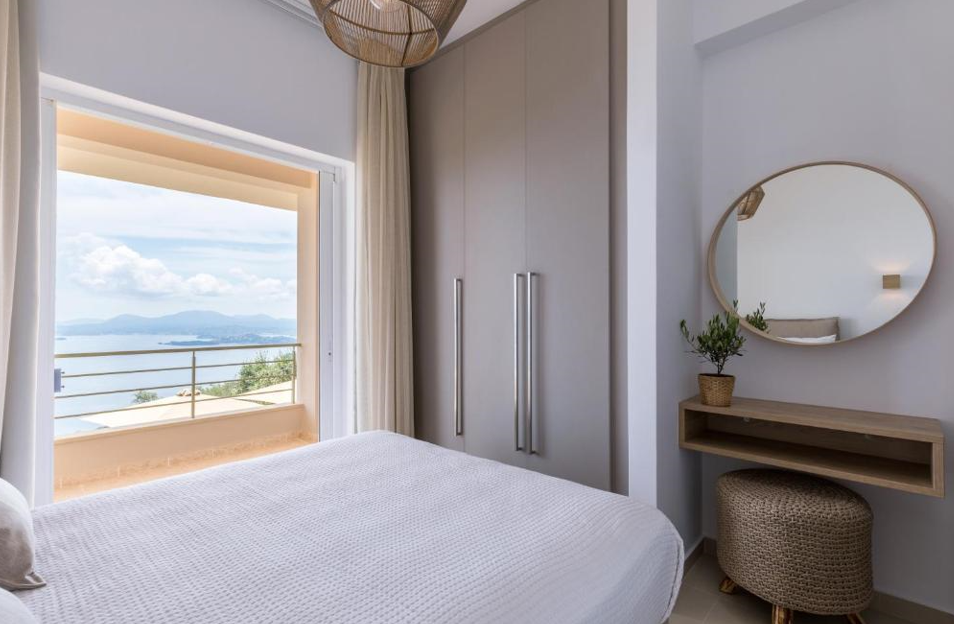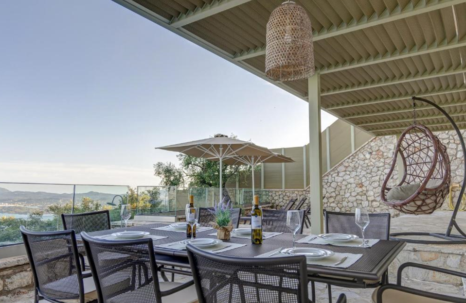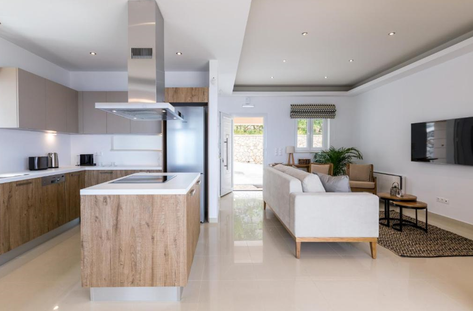 Built in 2015, this four-bedroom villa covers 186 m² on a 750 m² plot, combining clean design with uninterrupted views over the Ionian Sea. Spread across three levels, the home has been planned to make the most of the natural light and the open surroundings. The main entrance opens into a spacious living area with large glass doors that lead straight out to a wide balcony — the perfect spot to unwind or share an evening meal outdoors. Inside, the open-plan kitchen connects easily with the dining space for eight, keeping the whole top level bright and sociable.