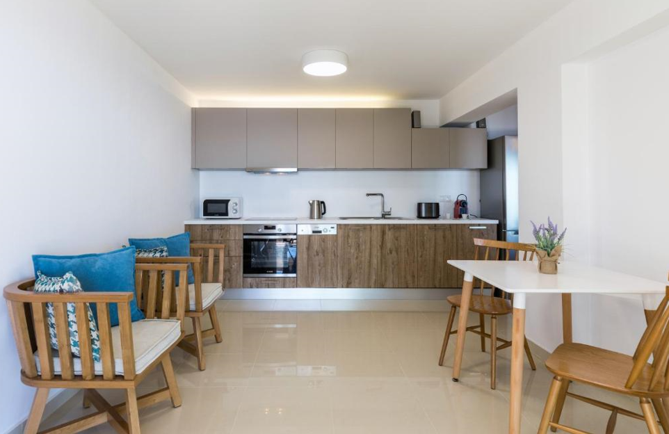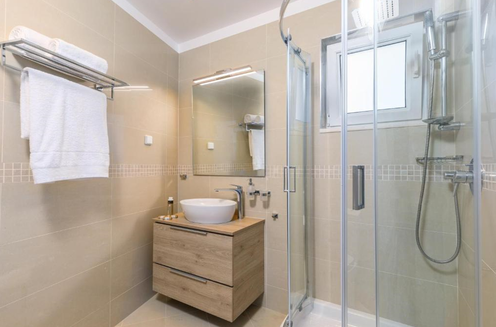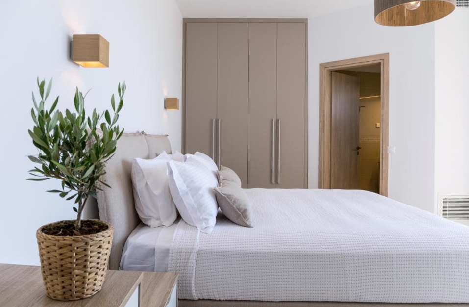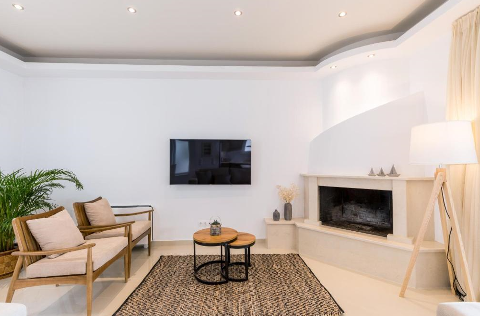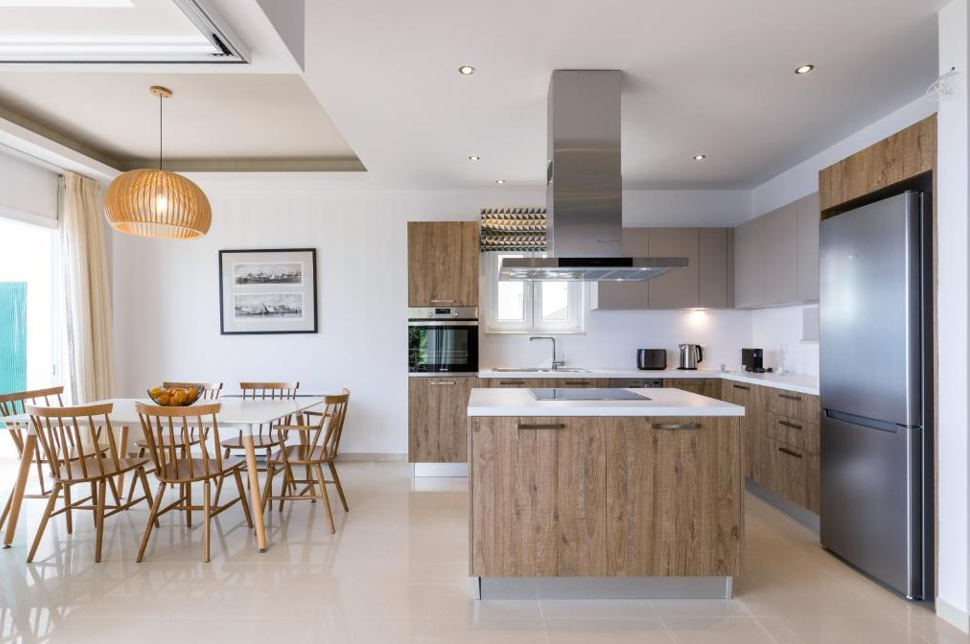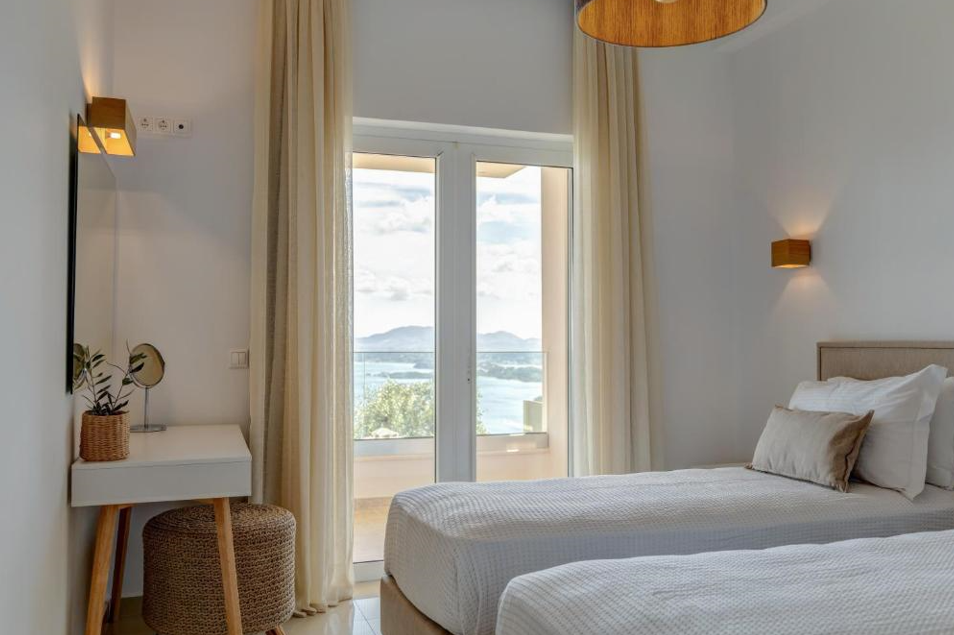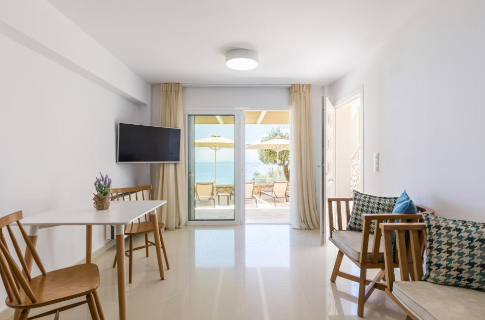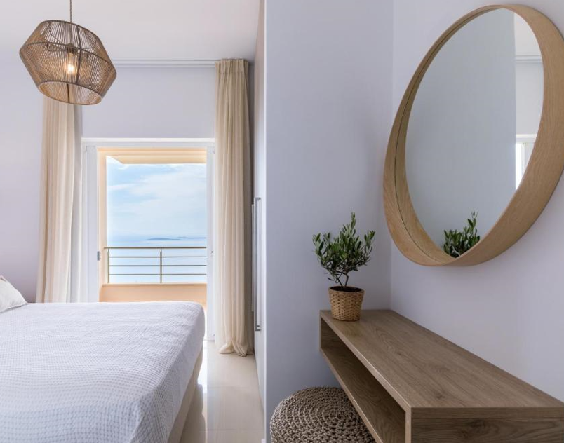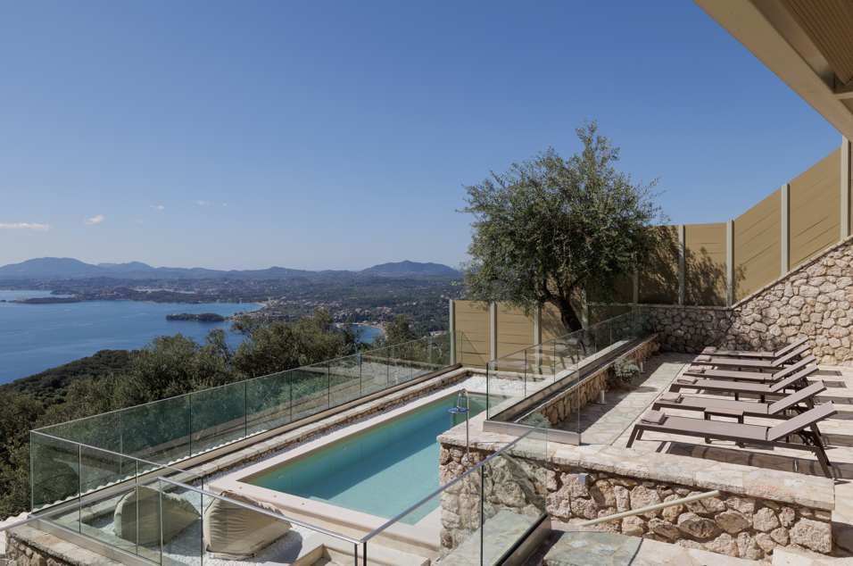 Built in 2015, this four-bedroom villa covers 186 m² on a 750 m² plot, combining clean design with uninterrupted views over the Ionian Sea. Spread across three levels, the home has been planned to make the most of the natural light and the open surroundings. The main entrance opens into a spacious living area with large glass doors that lead straight out to a wide balcony — the perfect spot to unwind or share an evening meal outdoors. Inside, the open-plan kitchen connects easily with the dining space for eight, keeping the whole top level bright and sociable.