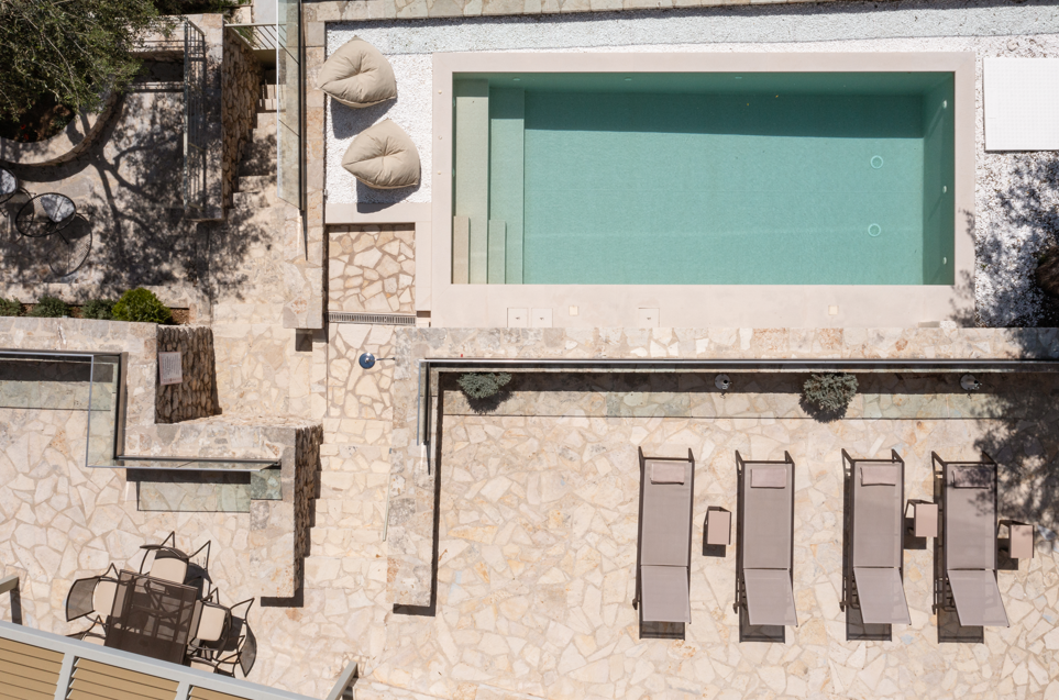 The ground floor offers an independent guest area — a one-bedroom space with its own kitchen, bathroom, and access to the pool terrace. Stepping outside, the private saltwater pool is surrounded by a comfortable sun deck, creating a peaceful setting framed by sea and greenery. Every detail of this property — from the natural light to the layout — reflects thoughtful design and lasting quality.