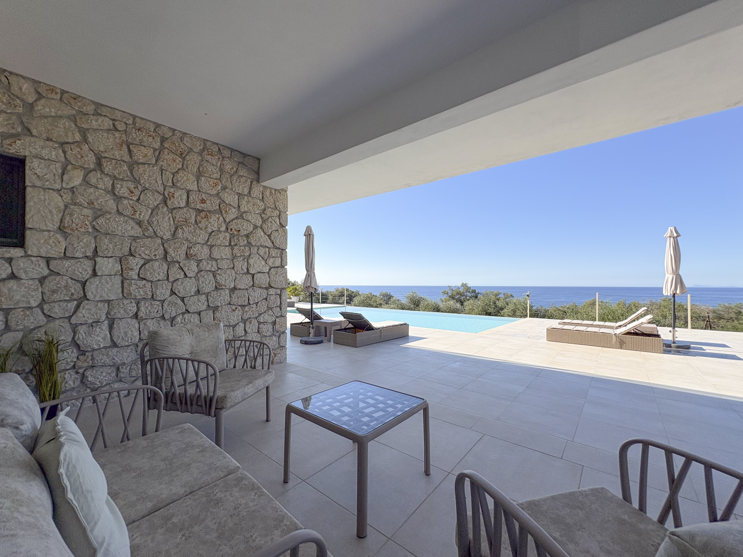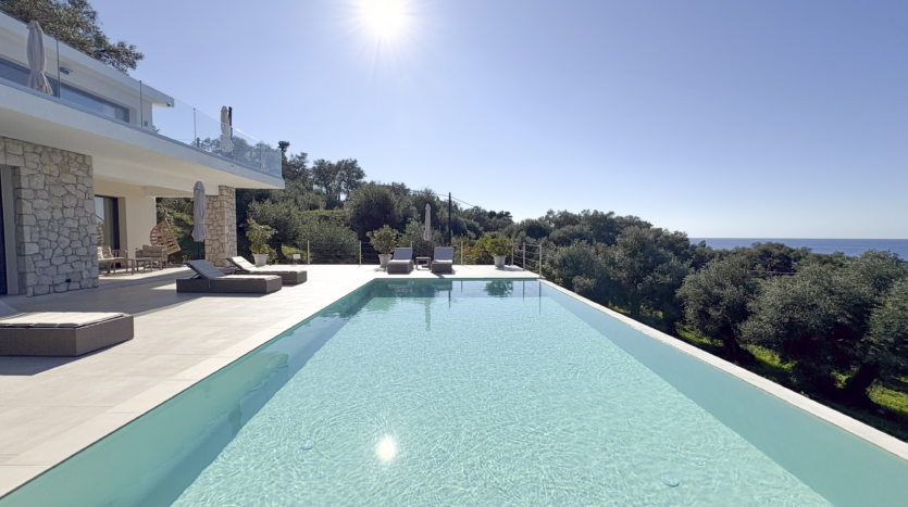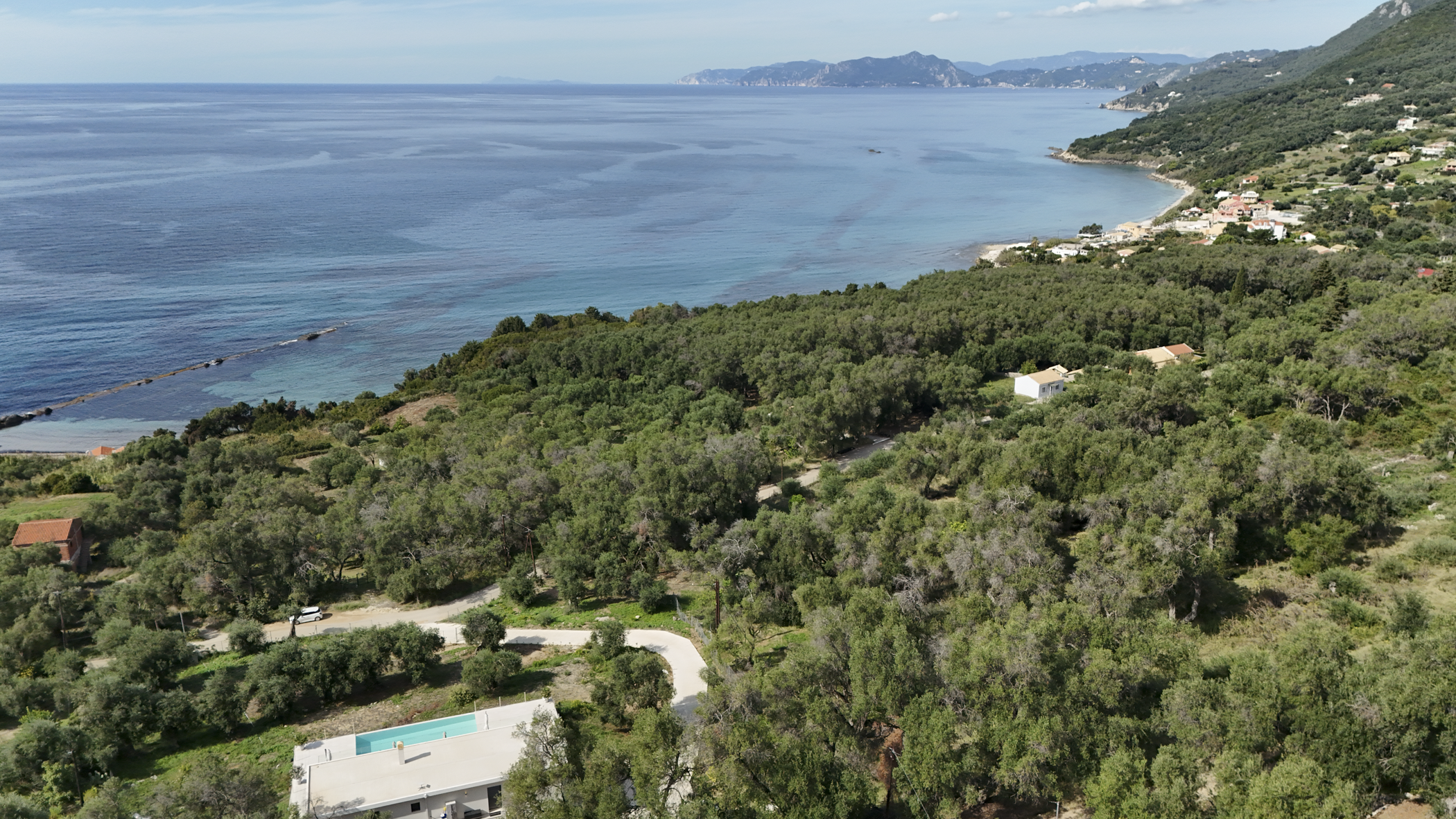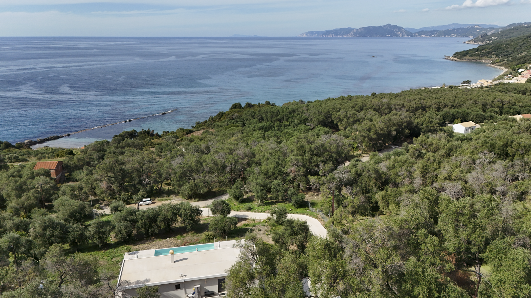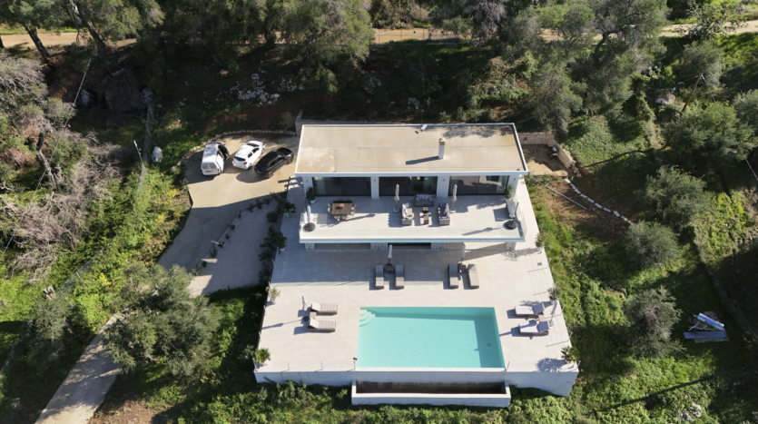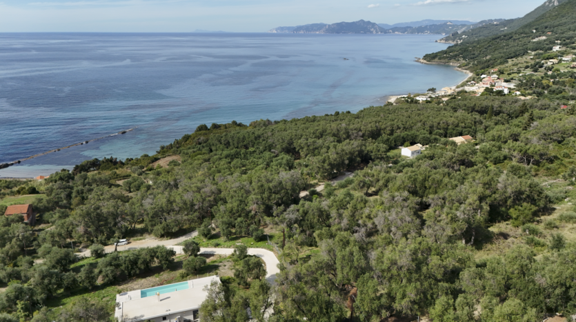 Tucked away in the peaceful area of Paramonas, this newly built villa offers total privacy and some of the most beautiful sea and sunset views on the west coast of Corfu. Set within a 4,040 m² plot surrounded by mature olive trees, it’s accessed via a private road that leads to a discreet parking area just behind the house.