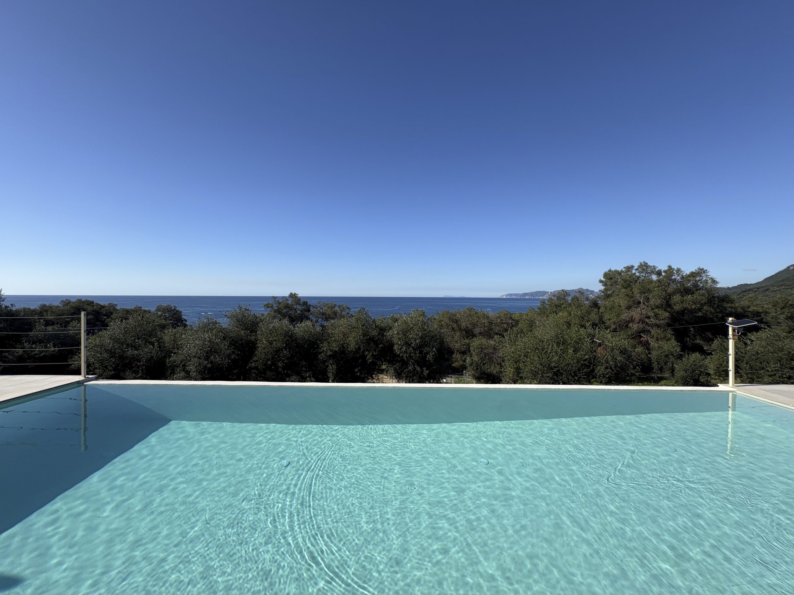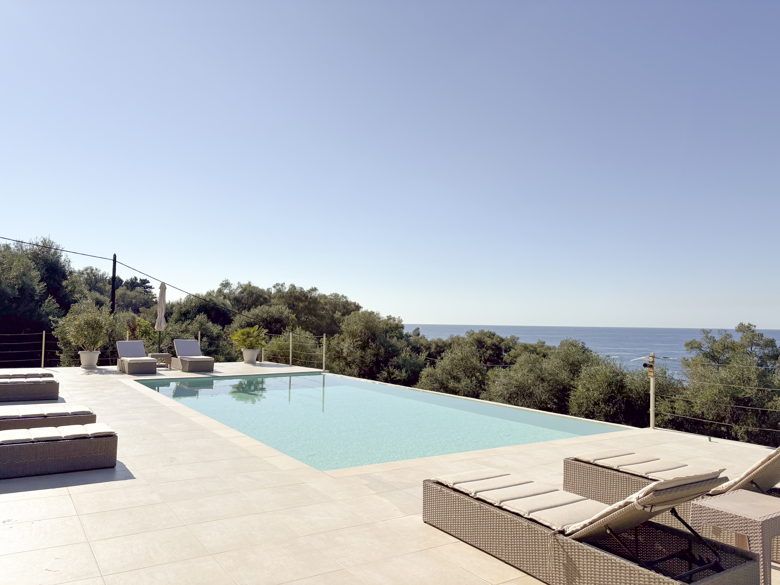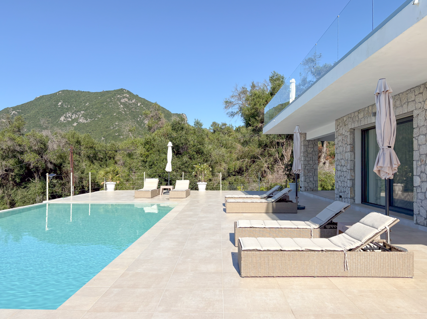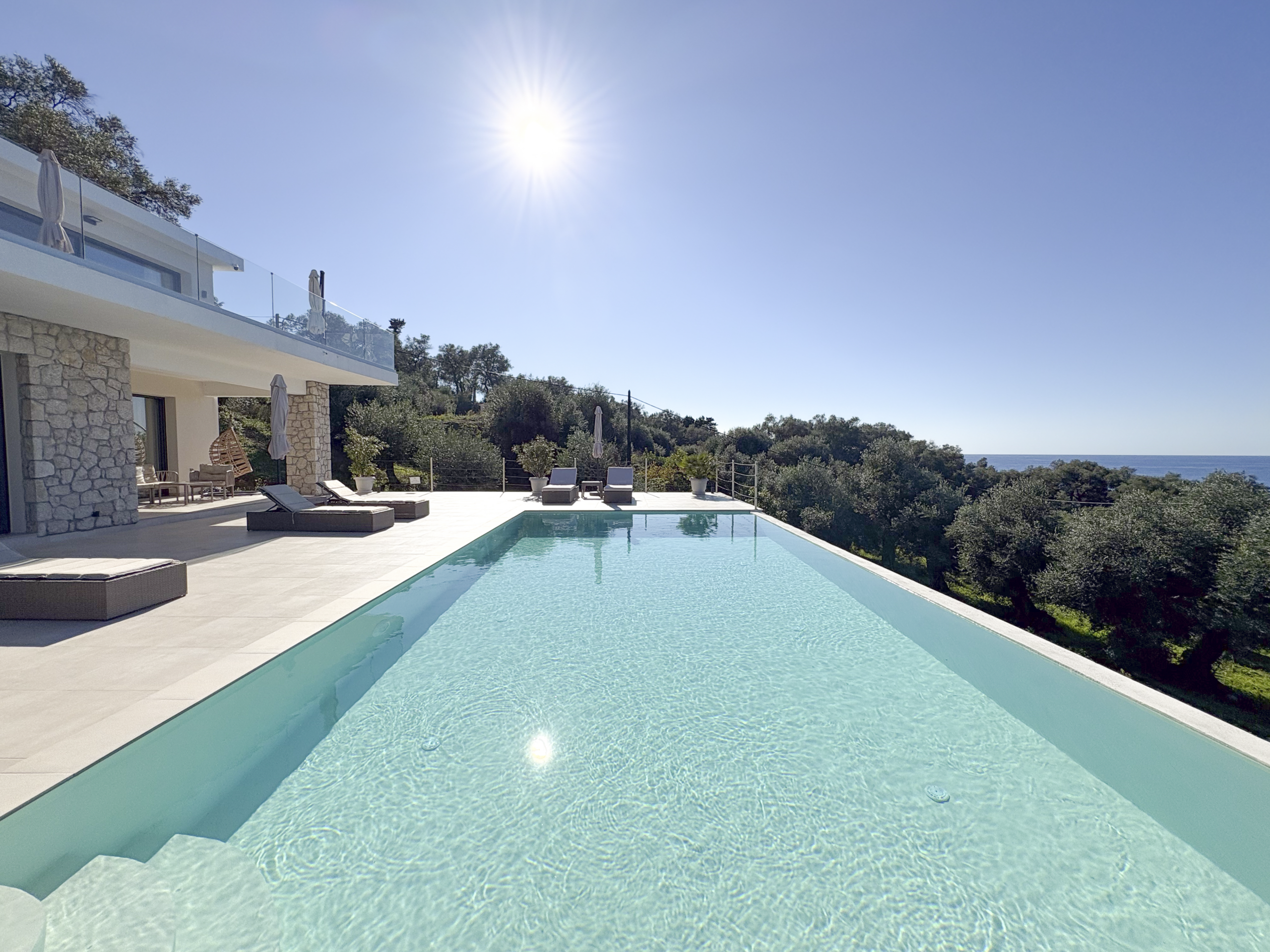 Tucked away in the peaceful area of Paramonas, this newly built villa offers total privacy and some of the most beautiful sea and sunset views on the west coast of Corfu. Set within a 4,040 m² plot surrounded by mature olive trees, it’s accessed via a private road that leads to a discreet parking area just behind the house.