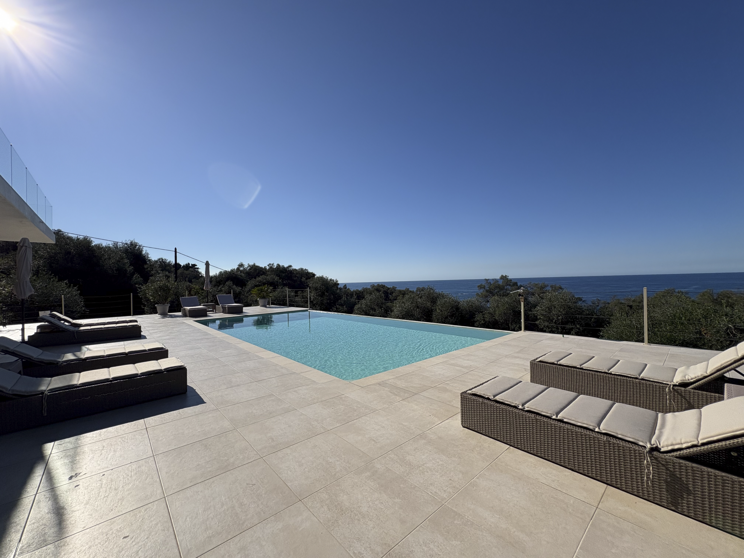 The ground floor includes three additional bedrooms, each with its own en-suite bathroom and direct access to a large terrace that leads to the swimming pool. The 10×5.5-meter pool is perfectly positioned to take in the open sea view and the glow of the evening sunset — ideal for relaxing or entertaining guests.