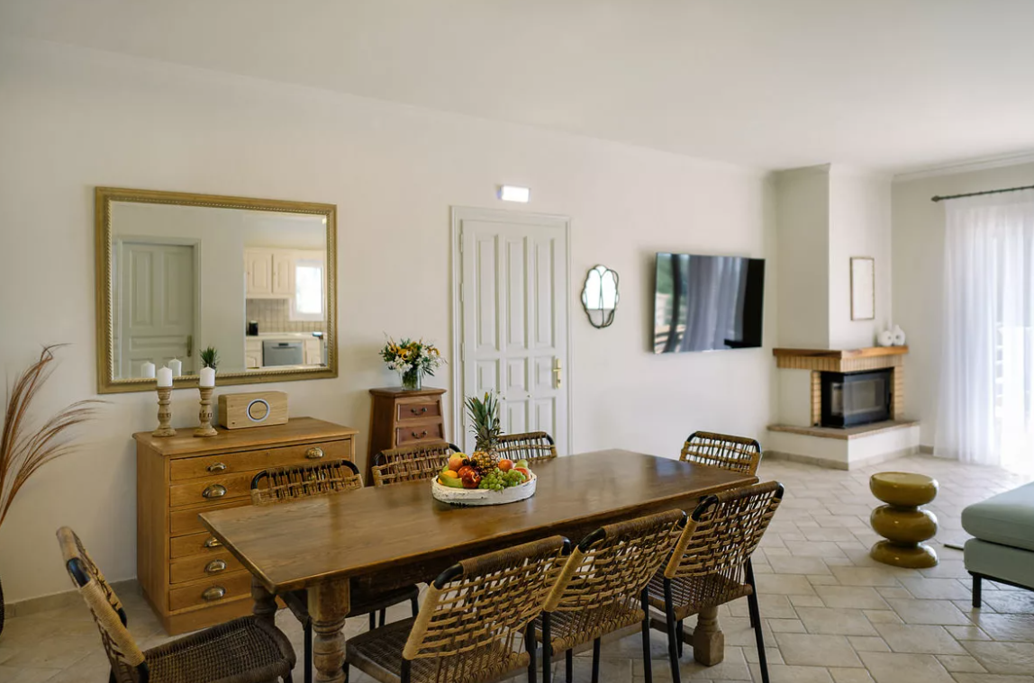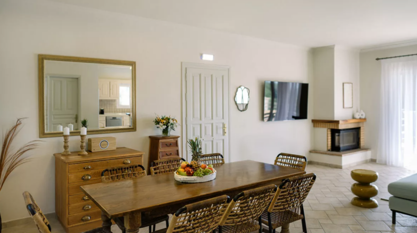 The living area is open and welcoming, centred around a fireplace and connected to the dining space and fully equipped kitchen. Large openings bring in natural light and connect the interior smoothly with the outdoor areas, making the home feel open and easy to live in.