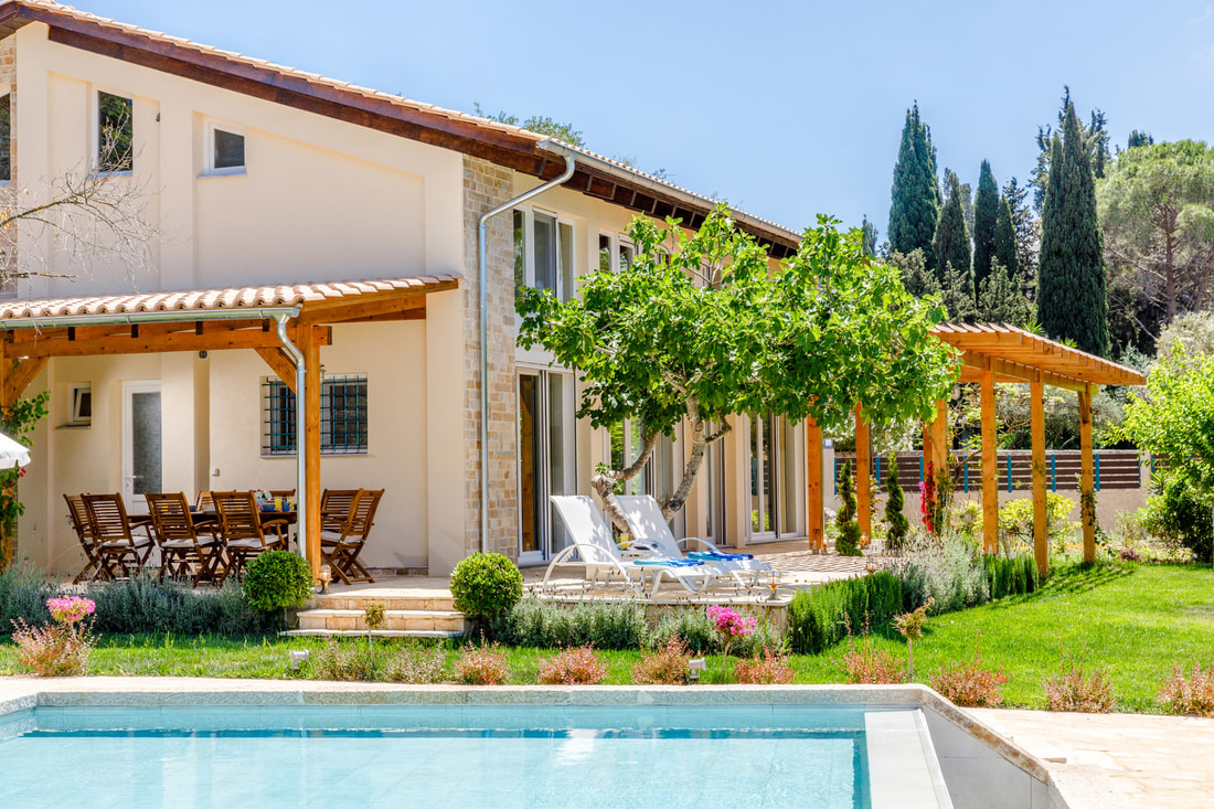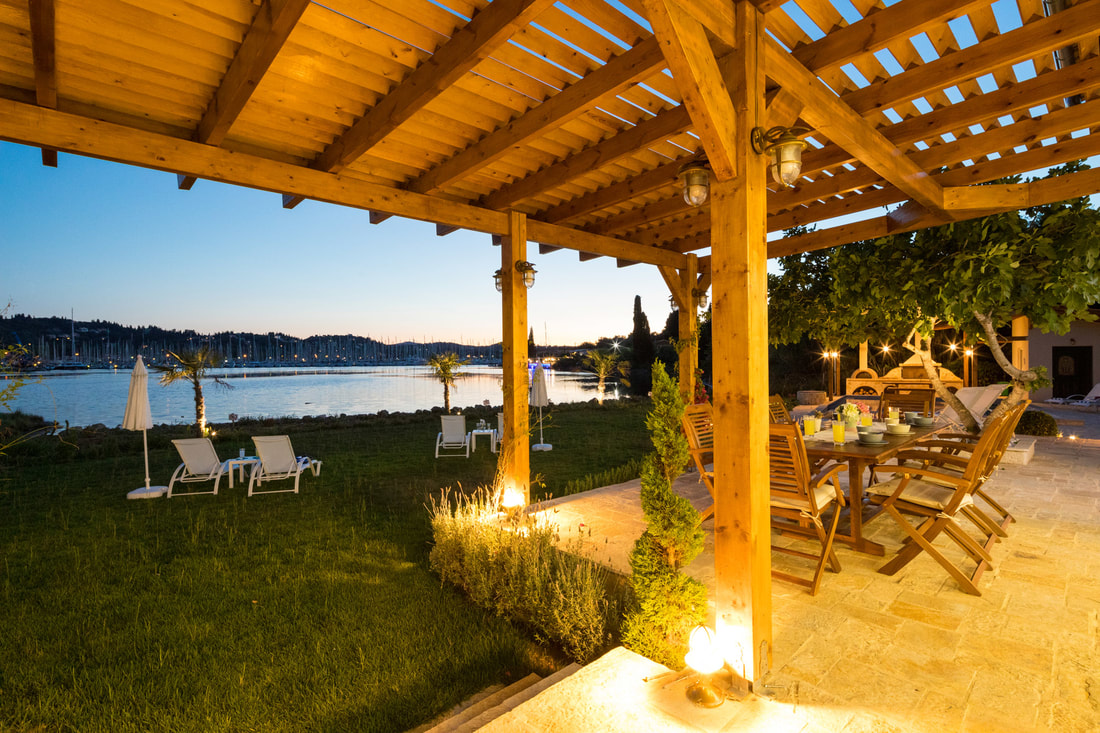 The outdoor space includes a private pool, a BBQ area, and furnished terraces ideal for dining or lounging. The garden is colorful and well maintained, with flowering trees, bay leaf trees, olive trees, and a fig tree at the rear of the property. The sea and port views are a highlight, especially at sunset, and the nearest beach is just 100 meters away. A separate accommodation can also be found in the garden area and adjoining pergola.
