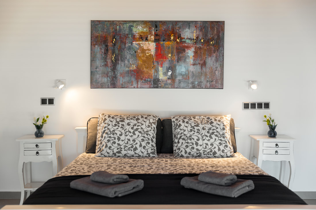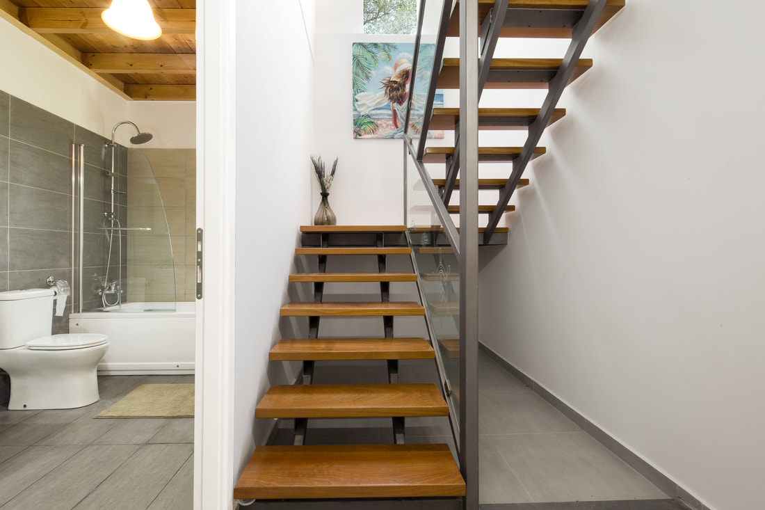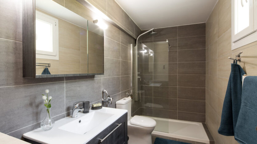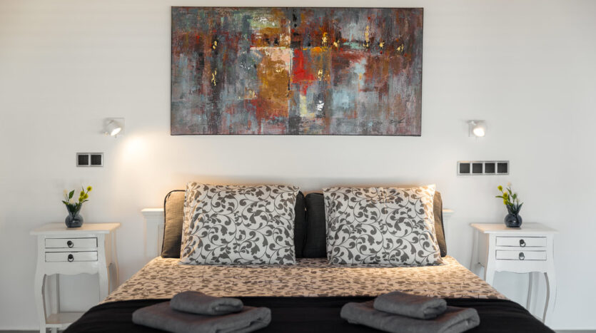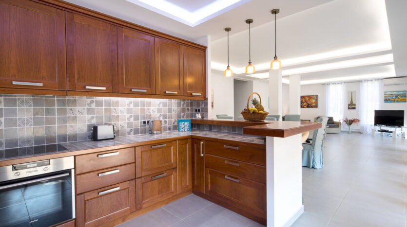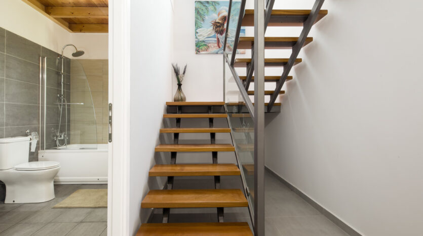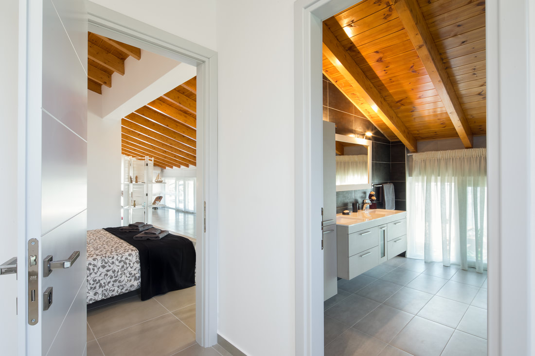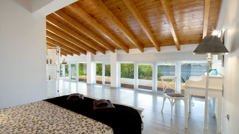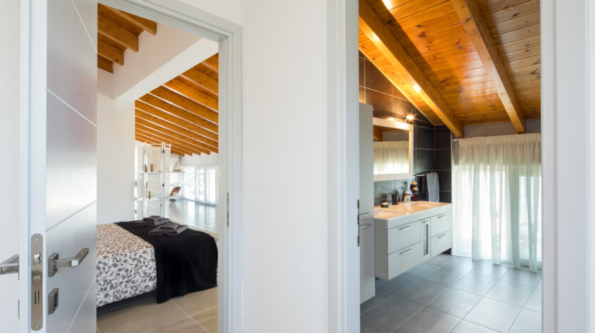 Stepping into the entrance hall, down the corridor into a spacious open kitchen, dining and living space, the cherry wood kitchen is immediately to your right, fully equipped and finished with high end natural materials. Ahead, the main living area opens up with plenty of natural light and direct access to the outdoor space. On the same level, two bedrooms are located, each with access to a bathroom one of which is en-suite. A central staircase leads to the upper floor, where you’ll find the master suite, complete with a private dressing room and full bathroom. There’s also a semi finished cinema room nearby, offering potential for a private entertainment space. Both floors are equipped with dressing rooms, and in total the villa has four bathrooms, two of them en-suite.