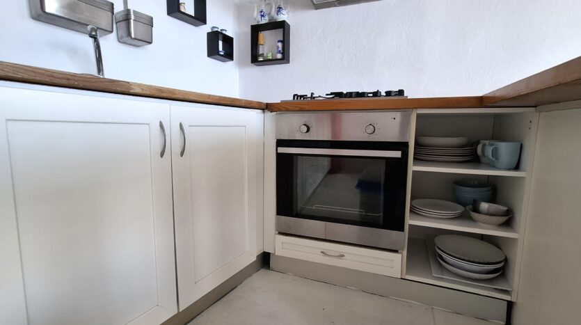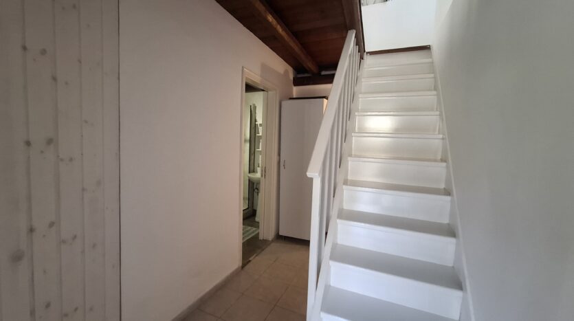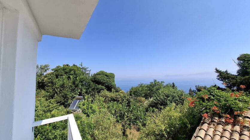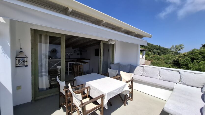 On the second floor, there is a kitchen and a balcony furnished with sofas, creating a comfortable spot to relax while enjoying the sea view. The ground floor, where the entrance is located, features a double bedroom and a WC. From here, stairs lead down to another level that includes a bathroom with a shower, an additional double bedroom, and access to a veranda that opens outside, though without a view.