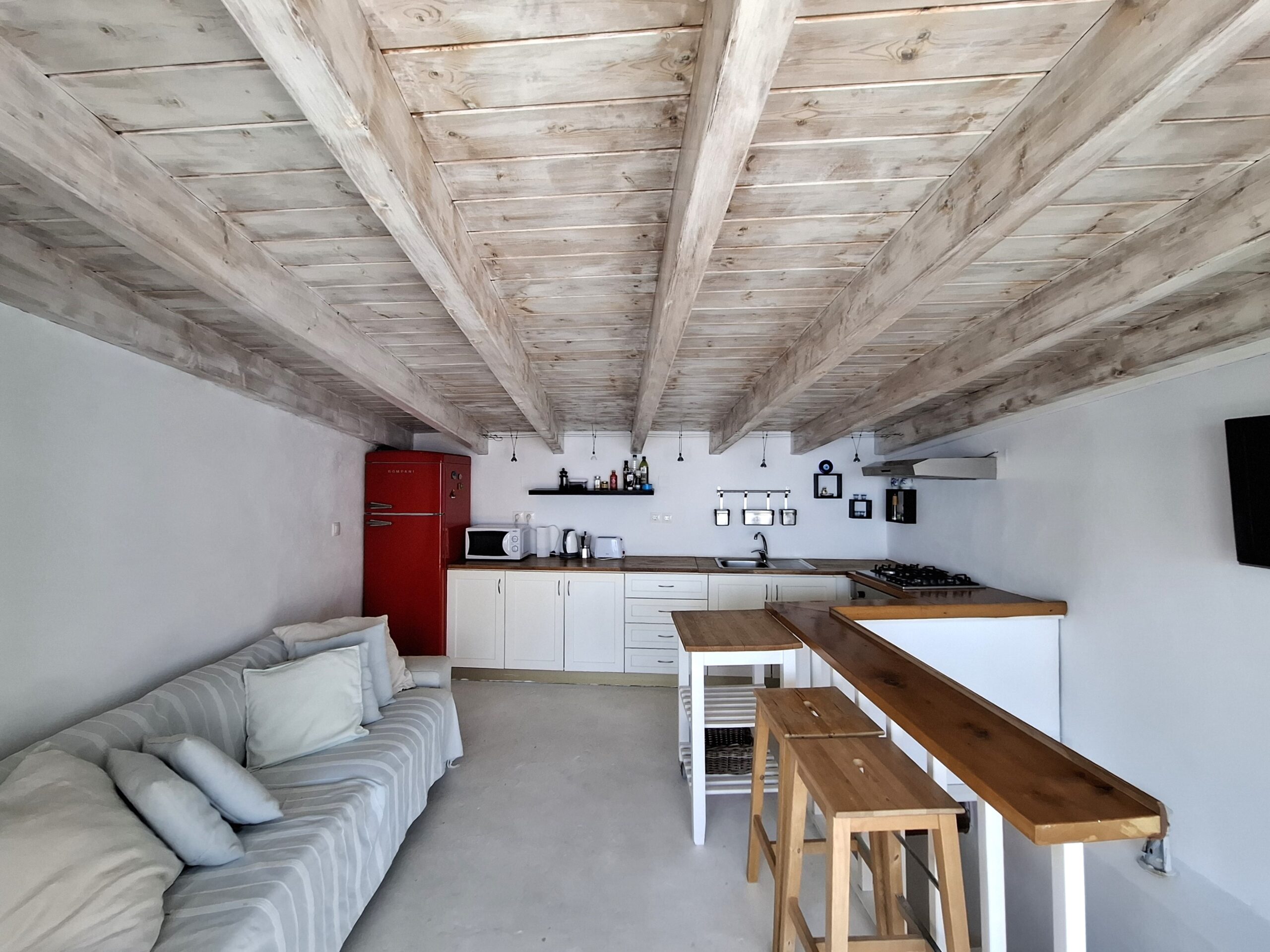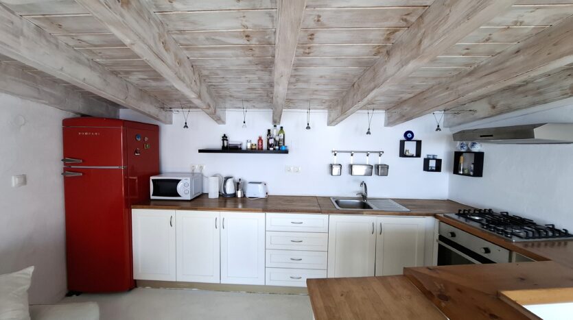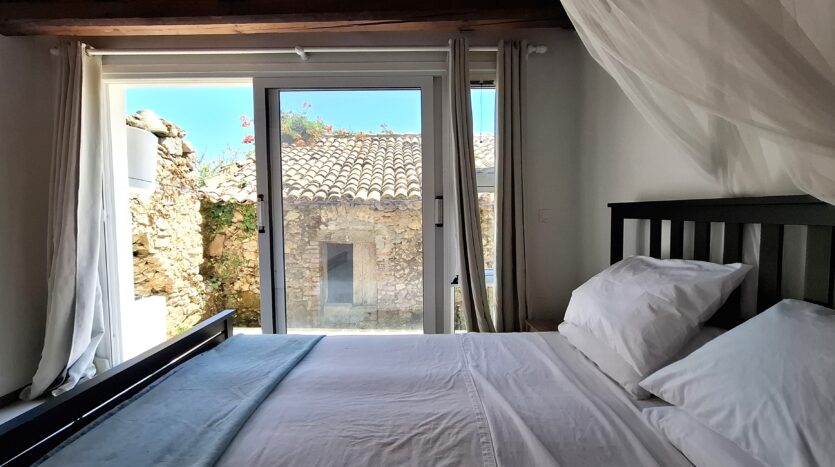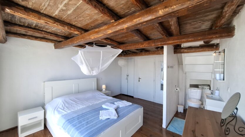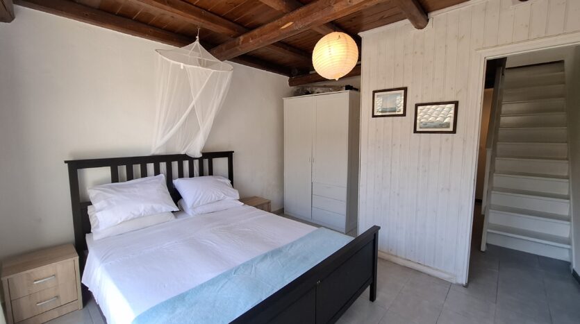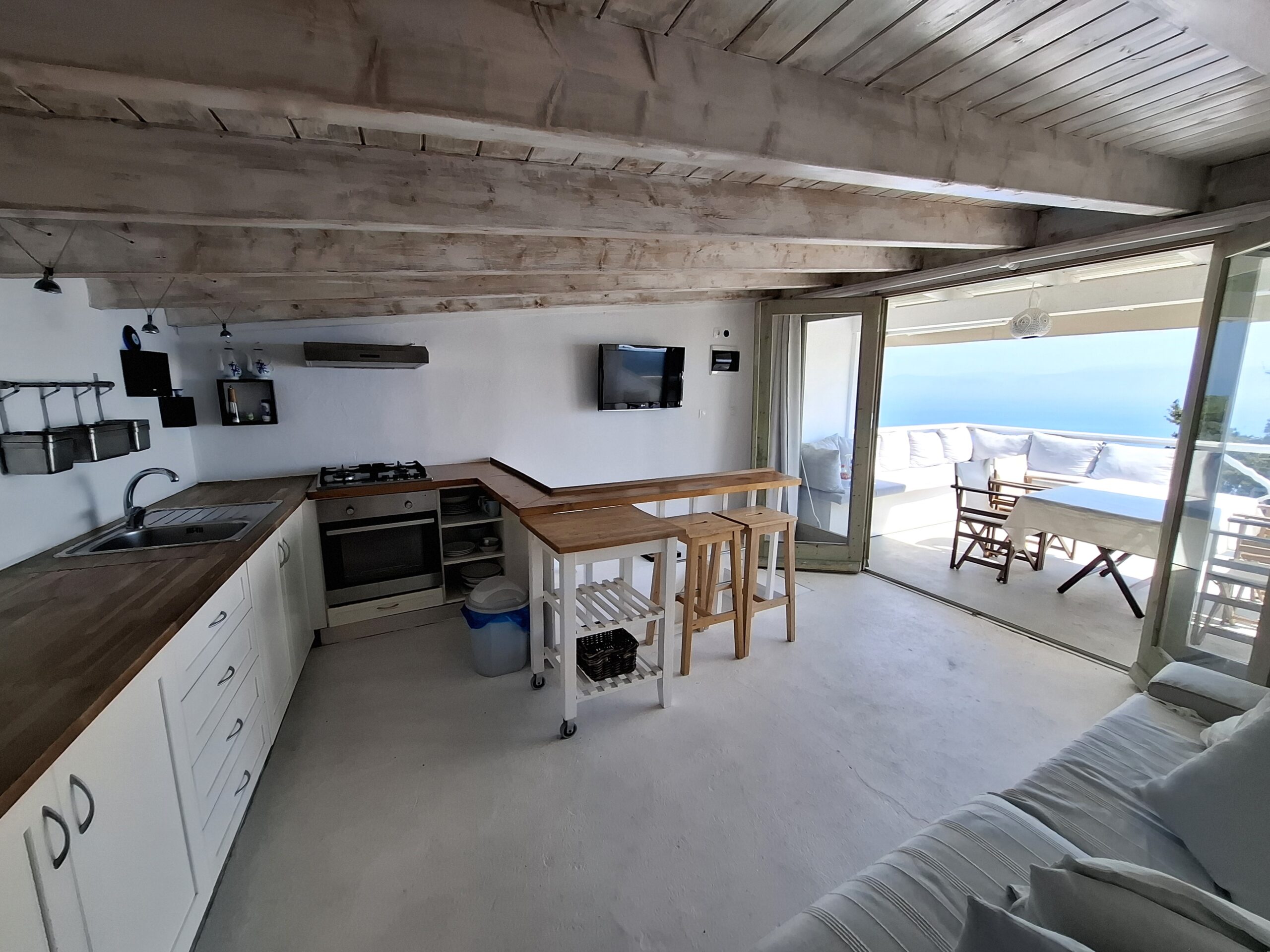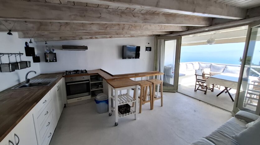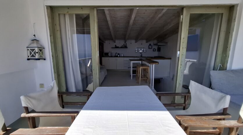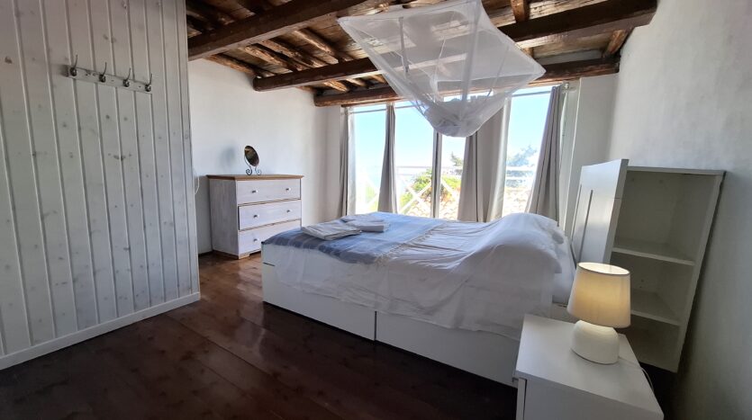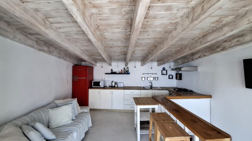 The interiors highlight wooden flooring and ceilings, with large window screens that fill the rooms with light and frame views of the sea. Just a five-minute walk takes you to the nearest tavern and the heart of the village, making it easy to connect with the local lifestyle.